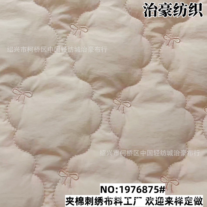 ピンクの蝶結び刺繍入りキルティング生地卸売秋冬ファッションデザイナー生地綿服化粧品バッグ生地