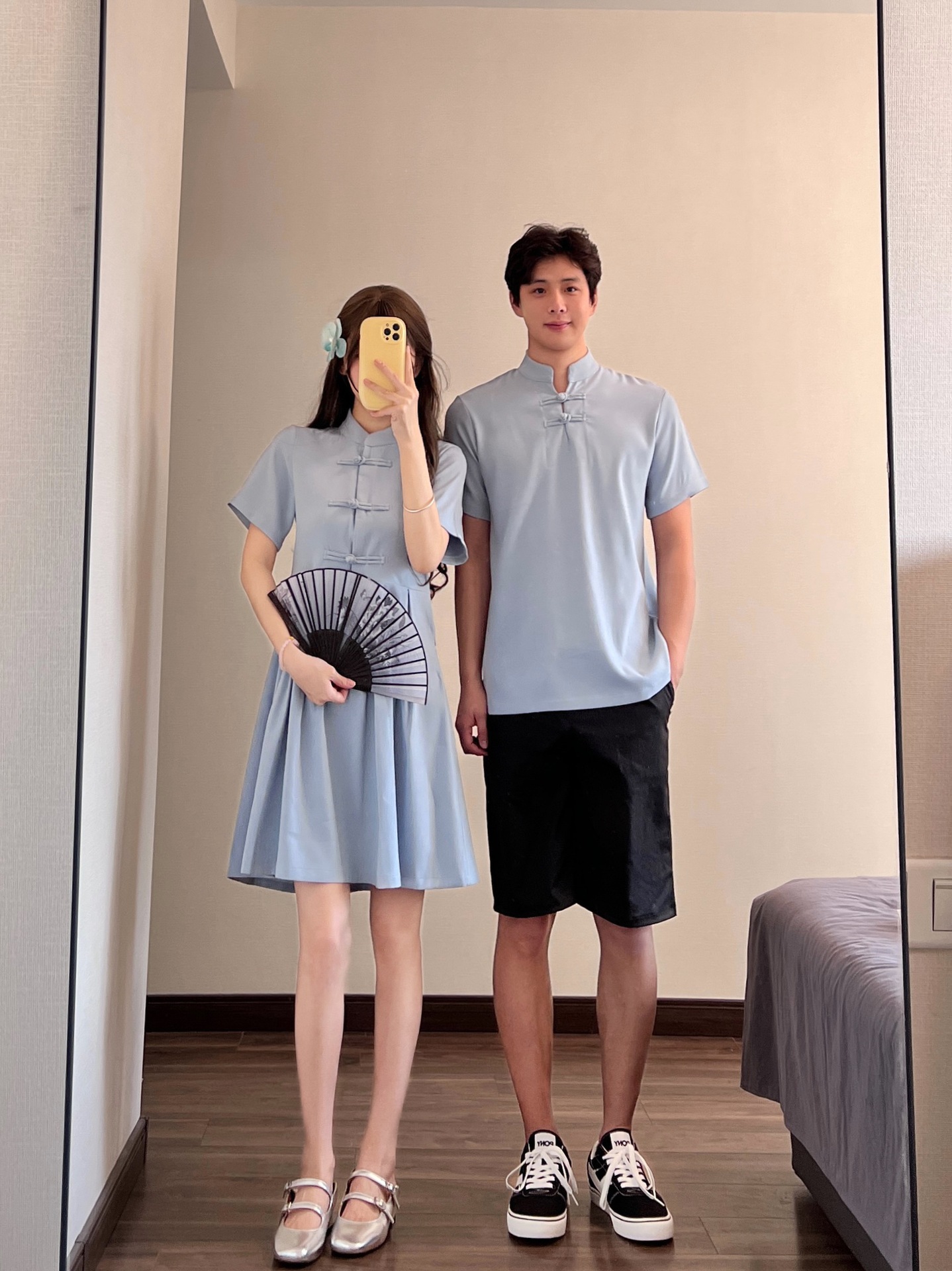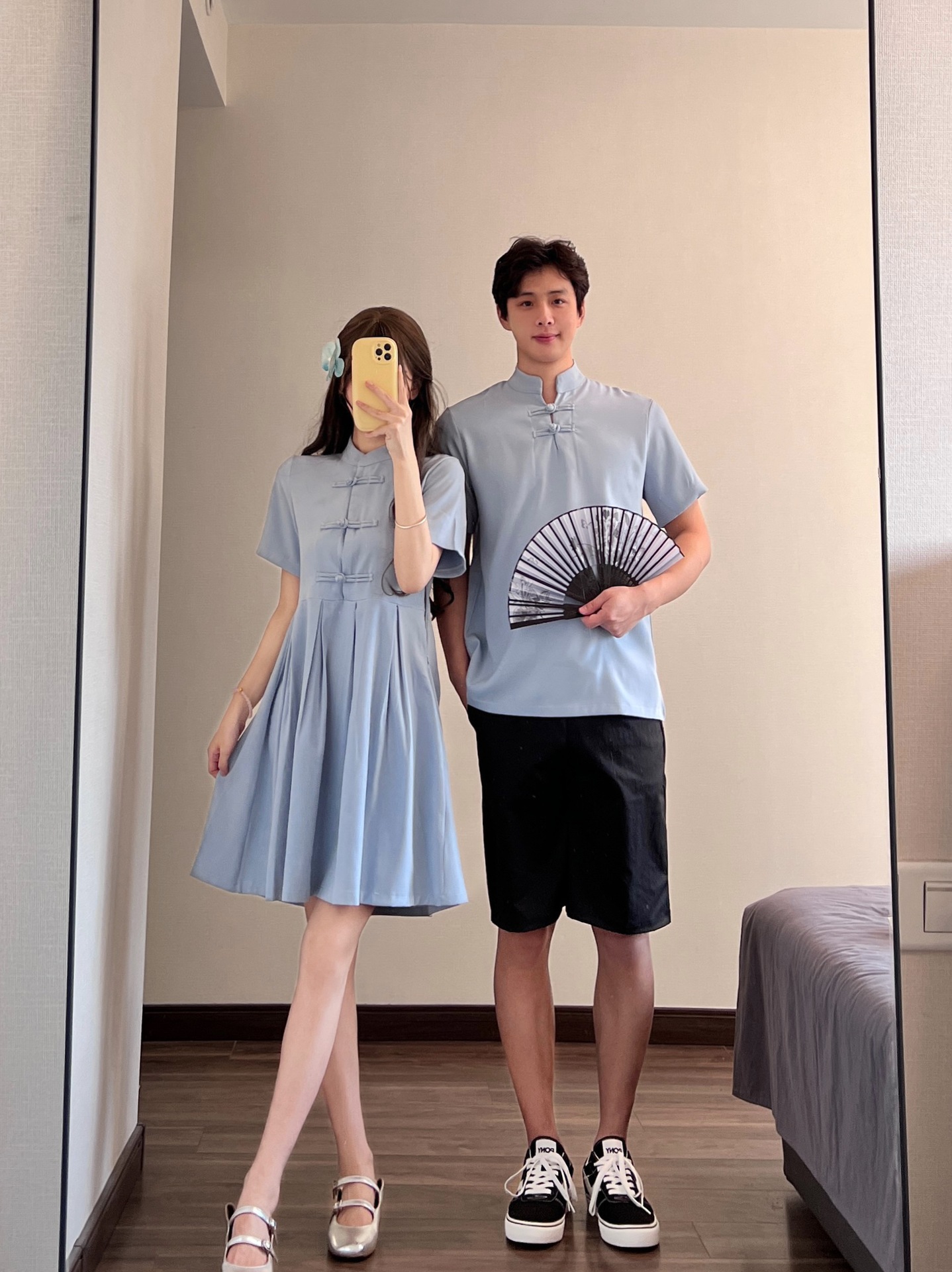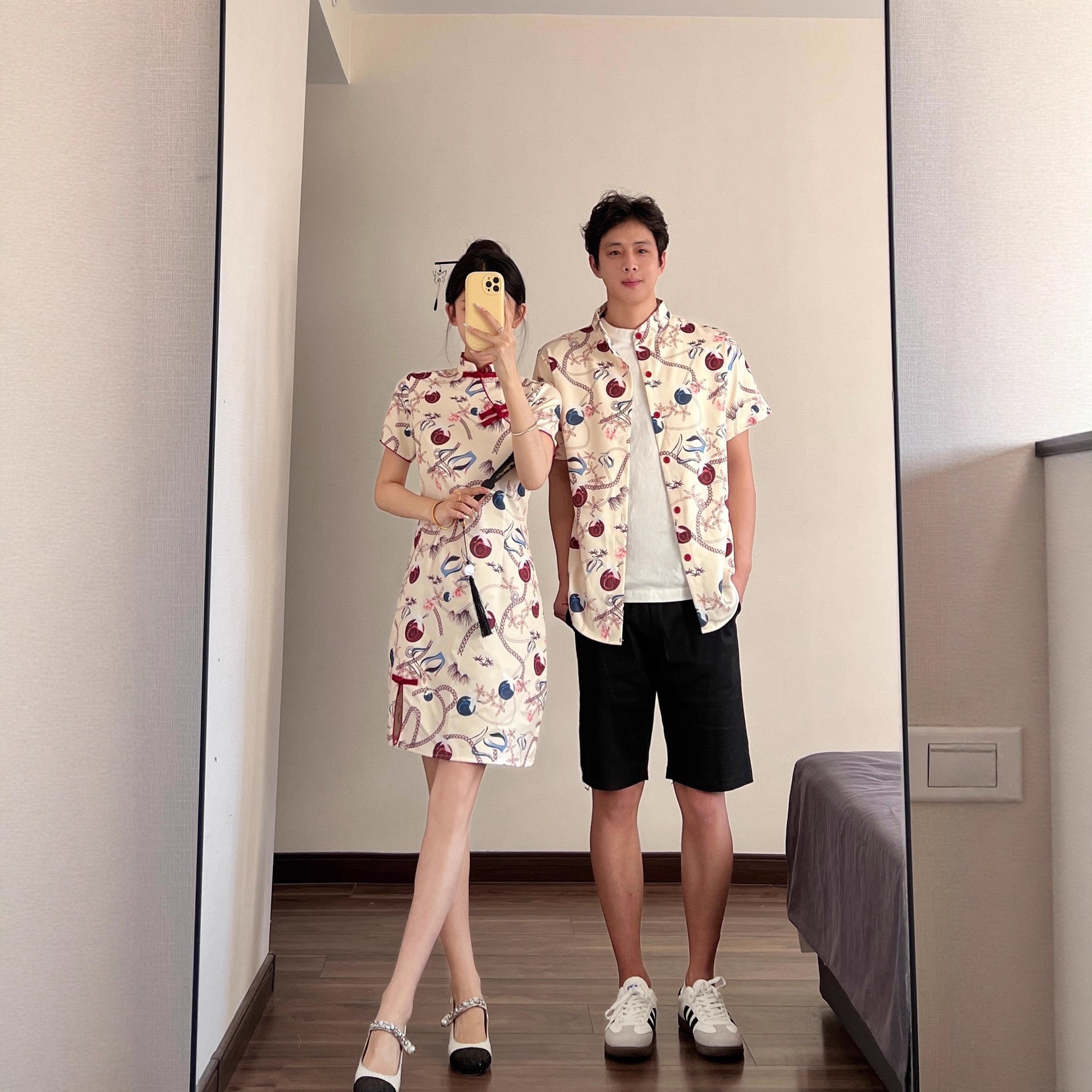 国潮新中式情侣装短袖衬衫夏季改良收腰百搭短款女设计旗袍连衣裙