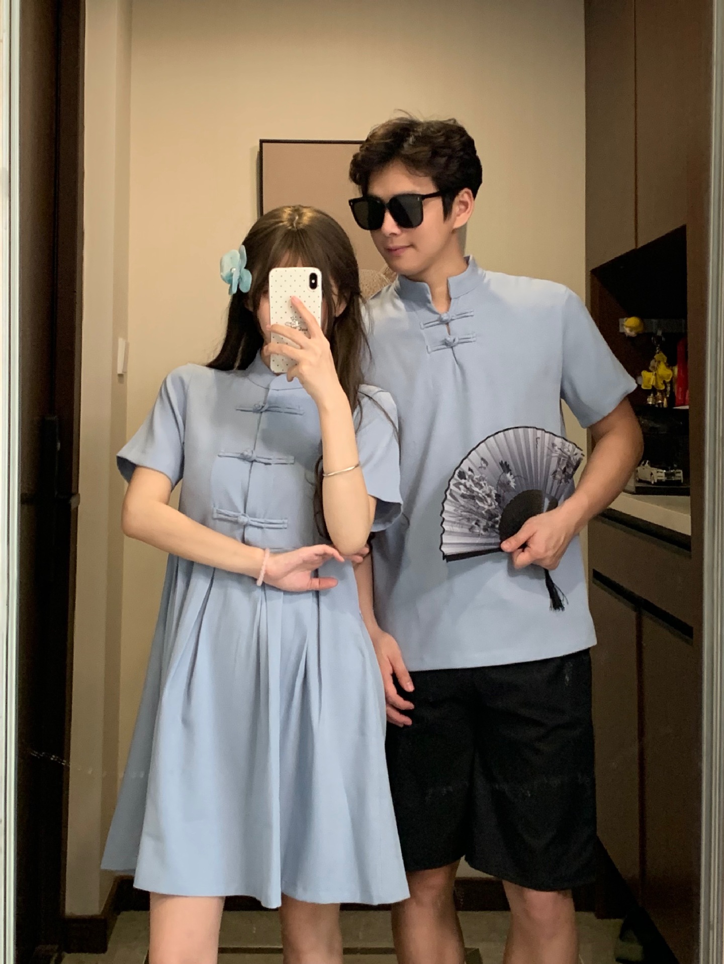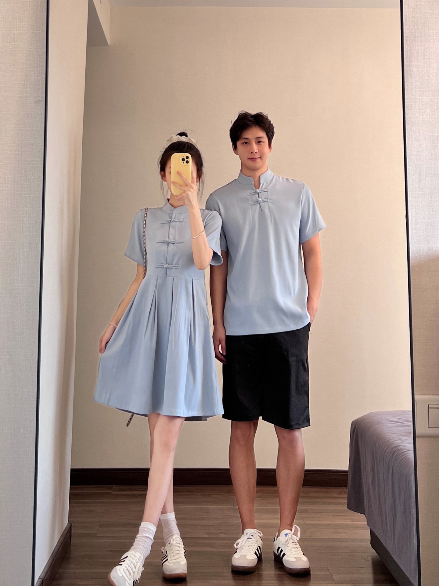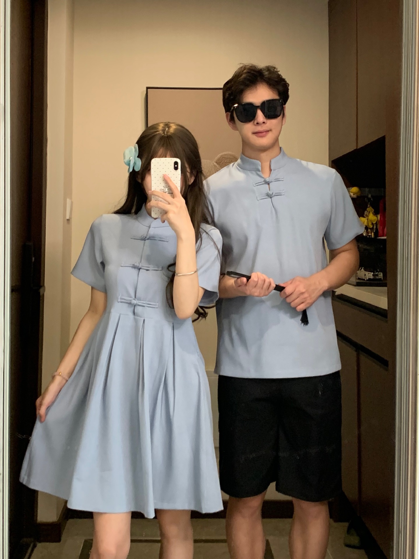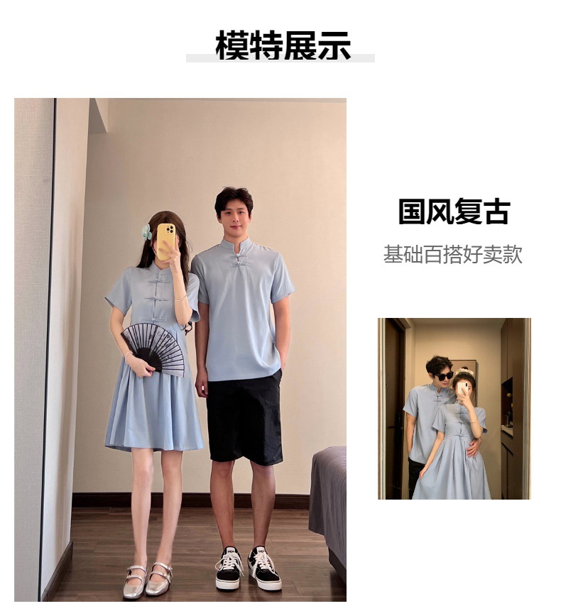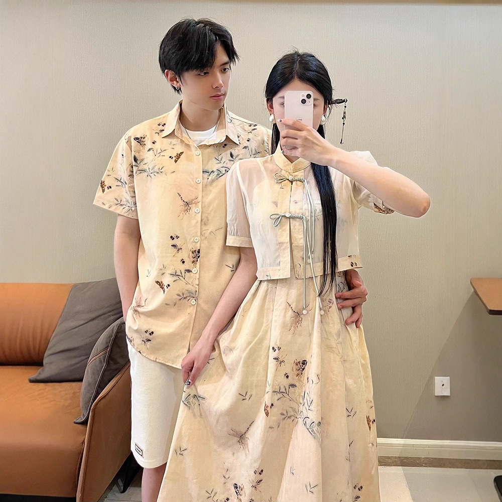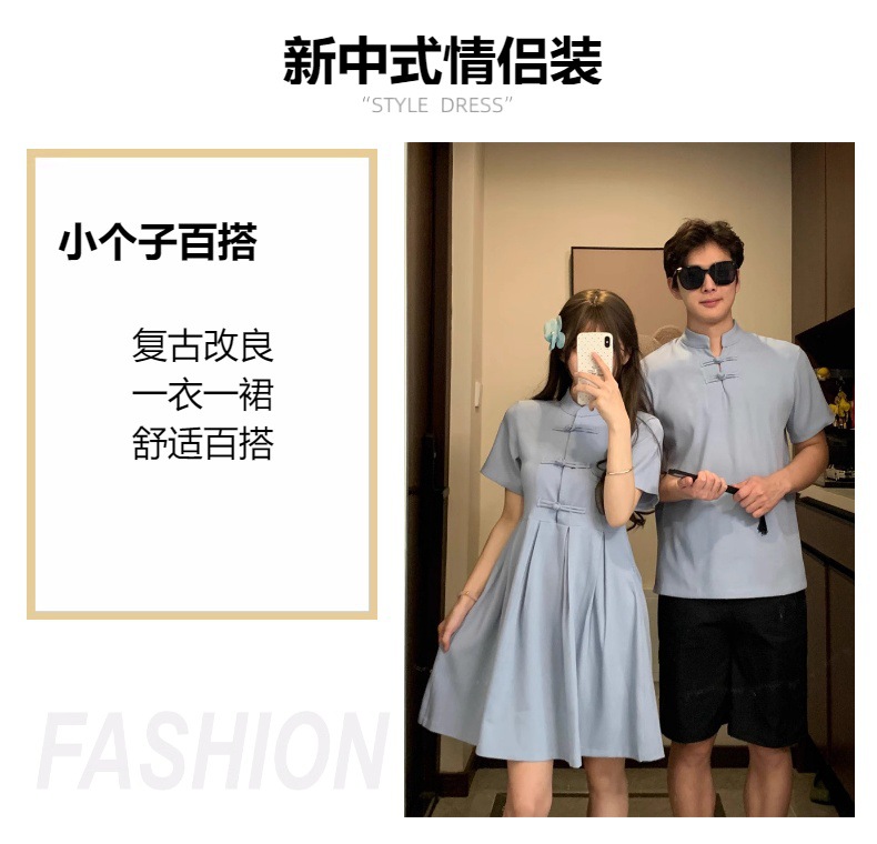 新中式国风情侣装夏季复古一衣一裙改良收腰立领盘扣短款旗袍衬衫
