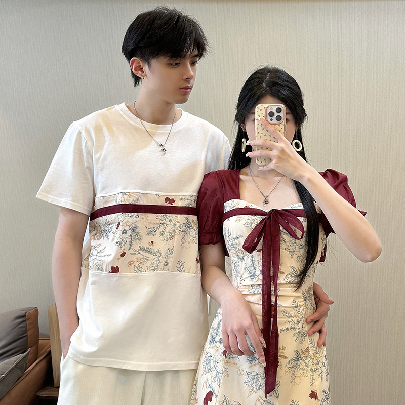 2021カップル服中国風漢服盤ボタン半袖tシャツ百合上着女子改良ワンピース学生クラス服