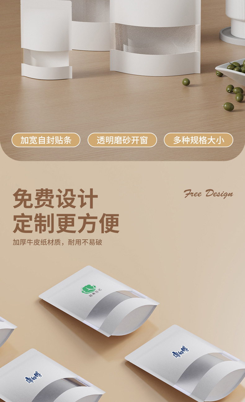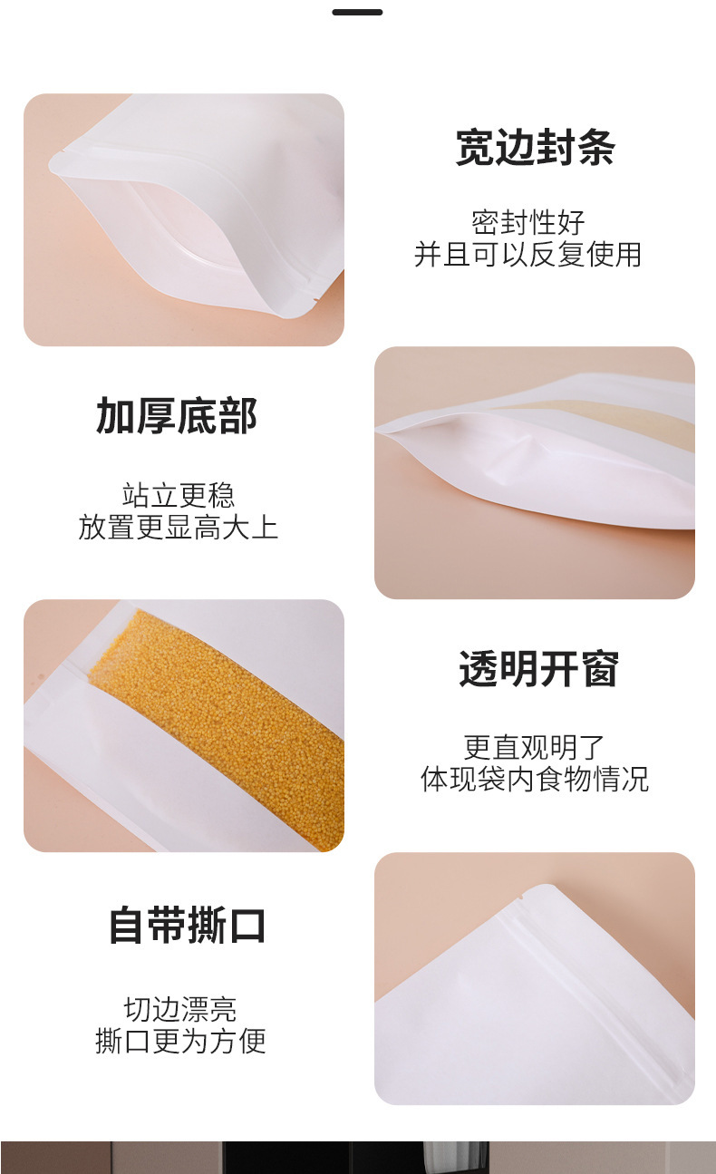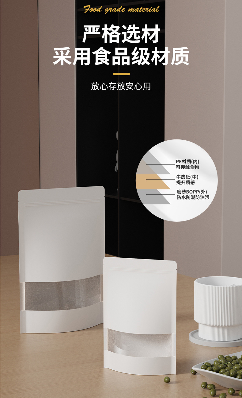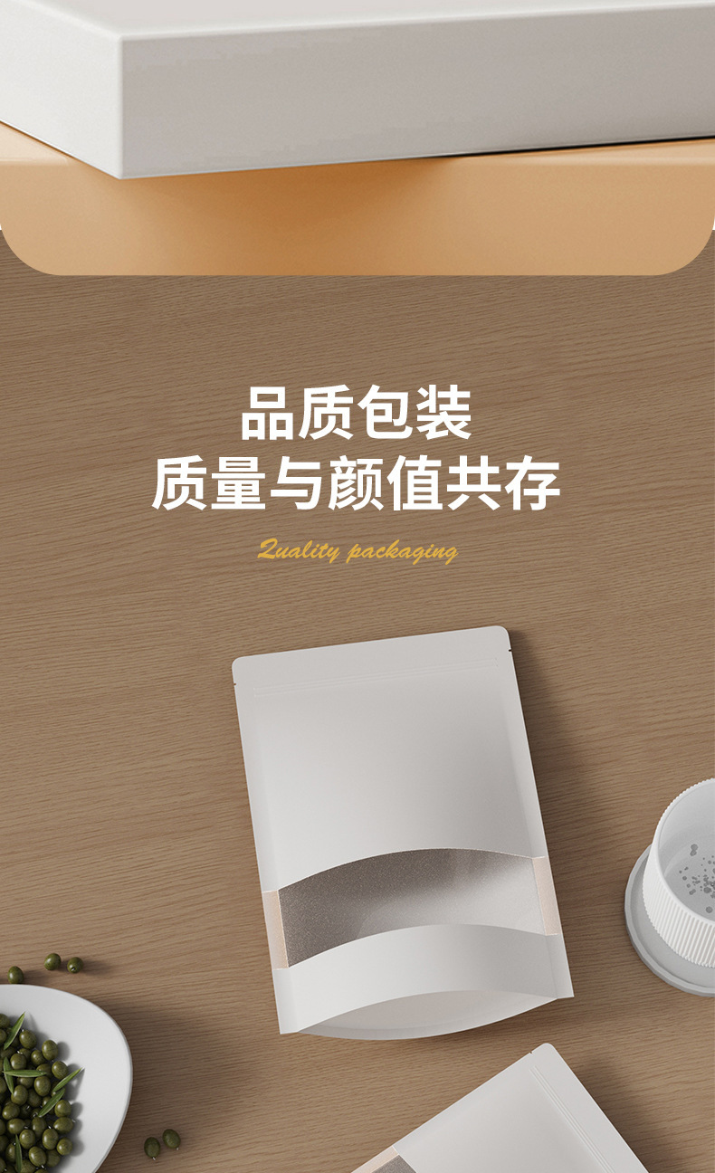 窓付き白色牛革紙製セルフシール自立袋 食品グレード ナッツ・茶葉・スナック袋 価格 密封 鮮度保持 環境に優しい