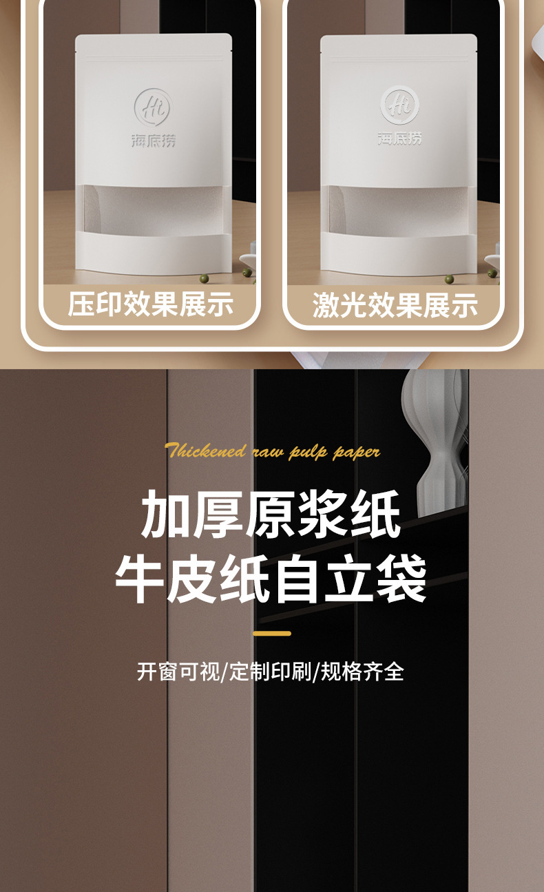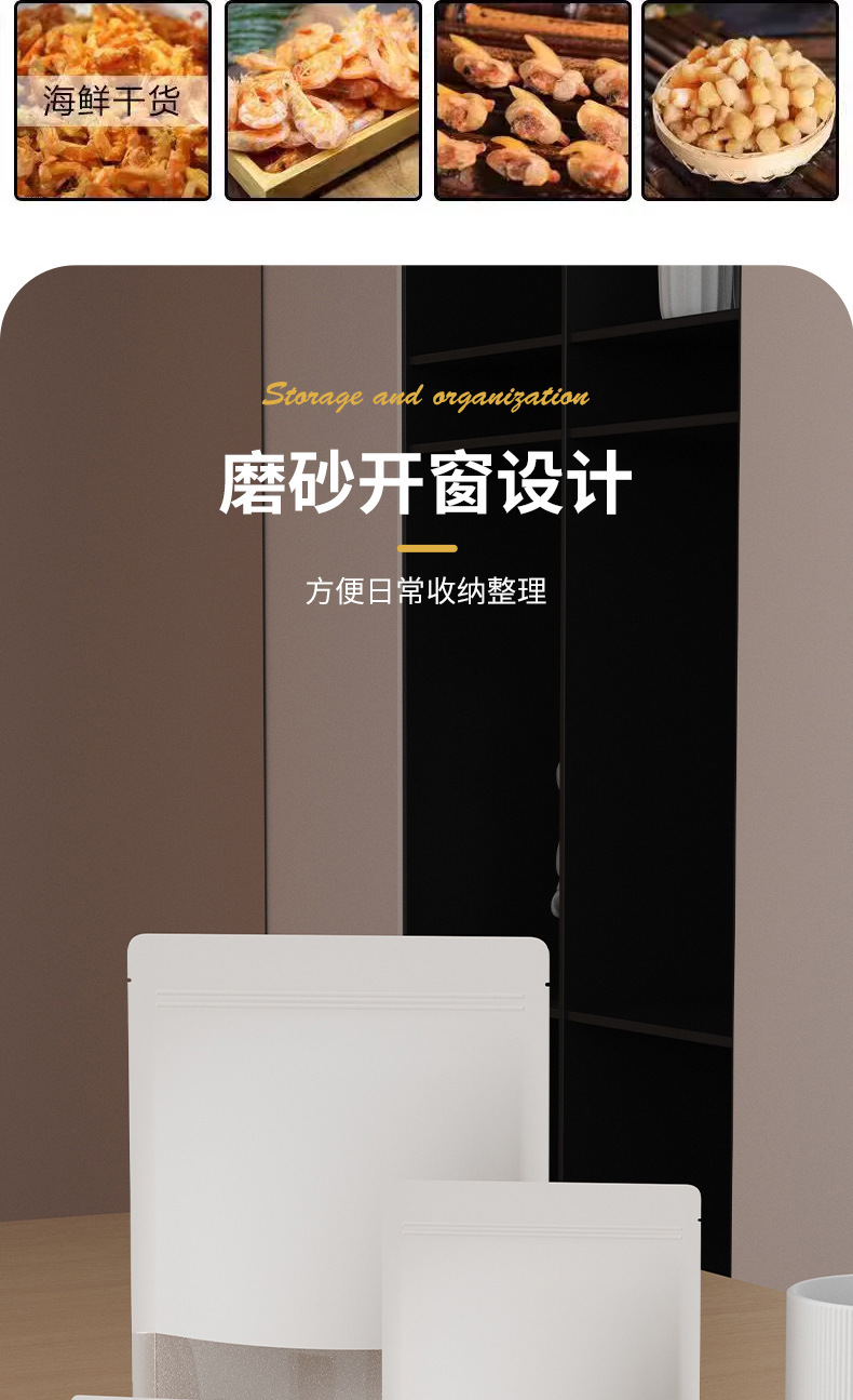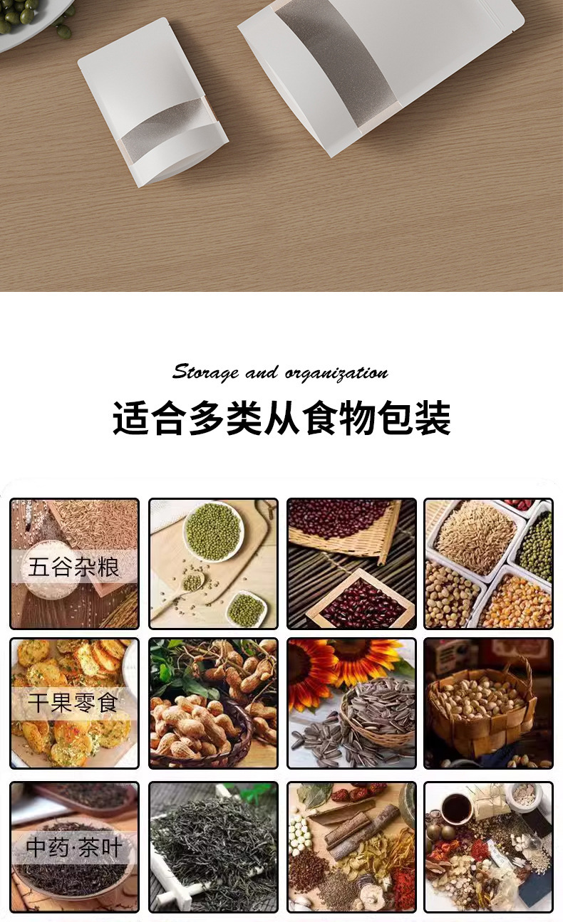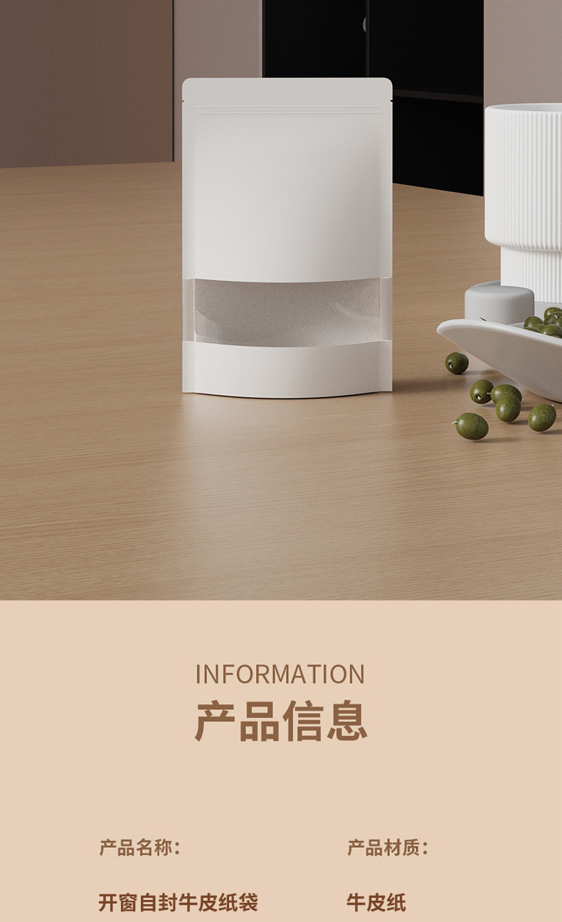窓付き白色牛革紙製セルフシール自立袋 食品グレード ナッツ・茶葉・スナック袋 価格 密封 鮮度保持 環境に優しい