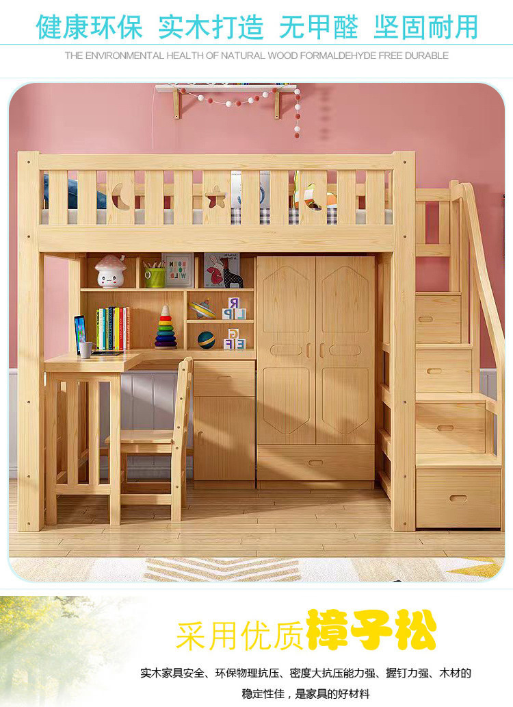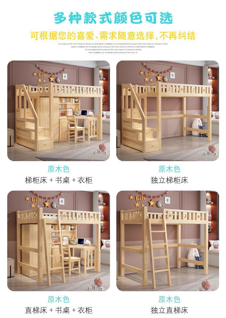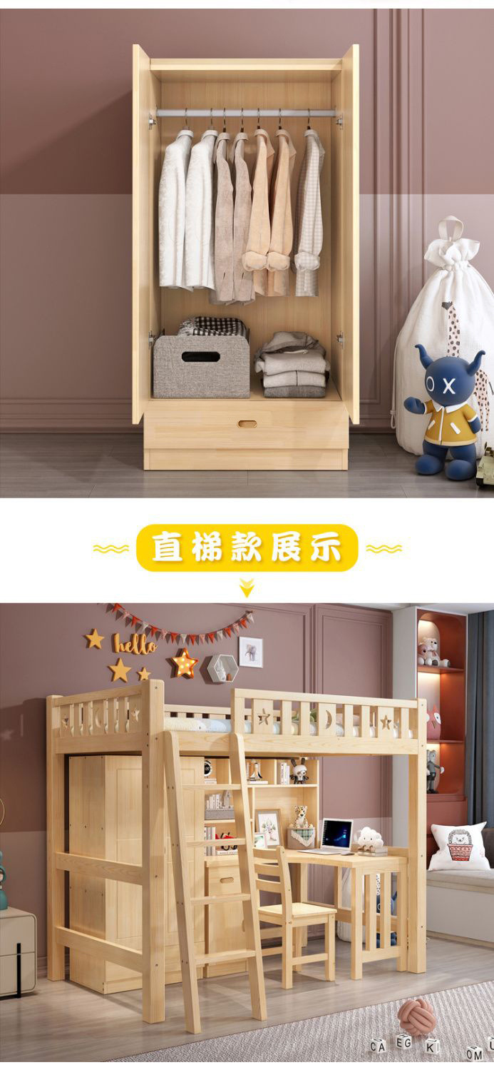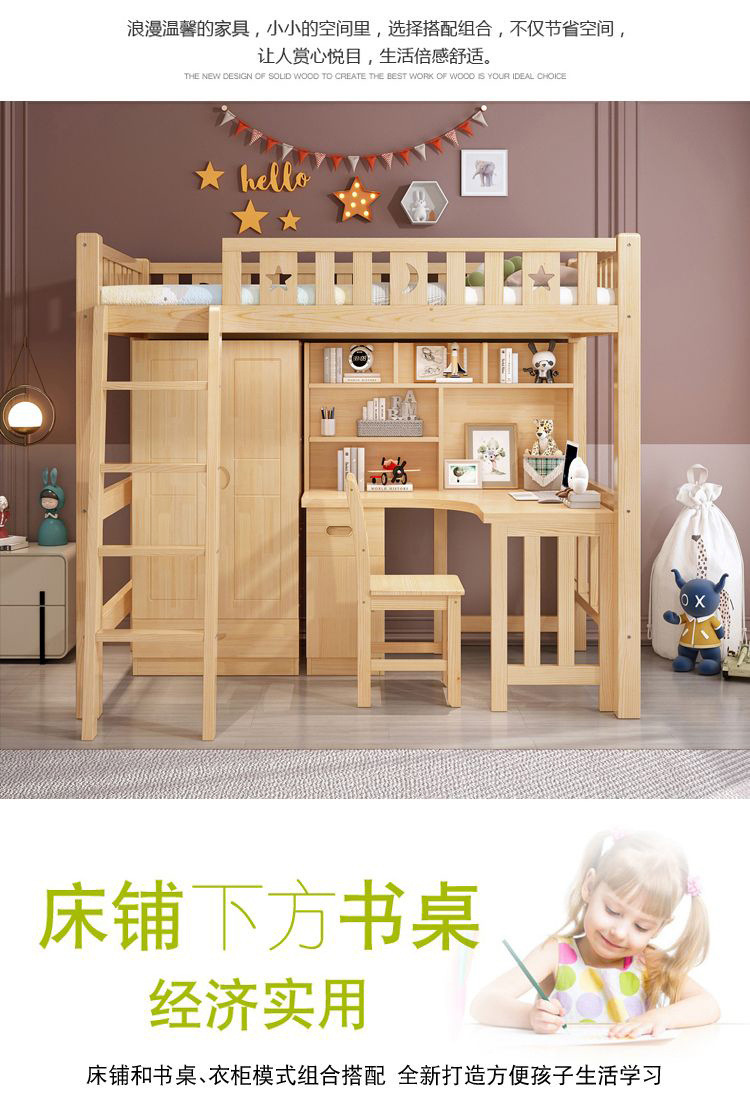 実木ベッド下テーブル高低ベッド一体組合せたんす多機能机学習ベッド高架小戸型工場