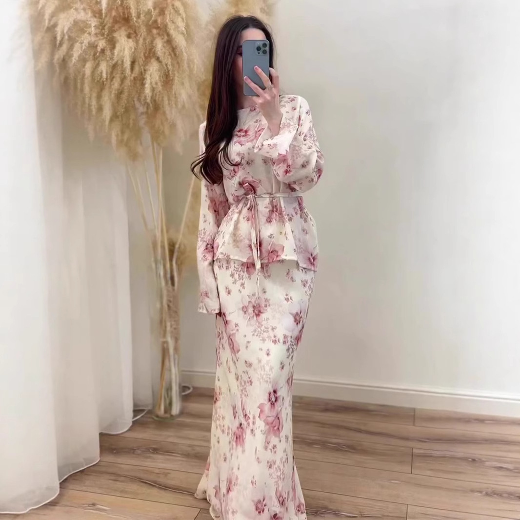 2025年秋新作 中東ドバイ風 花柄ランタン袖 ゆったりワンピース レディース ツーピースセット