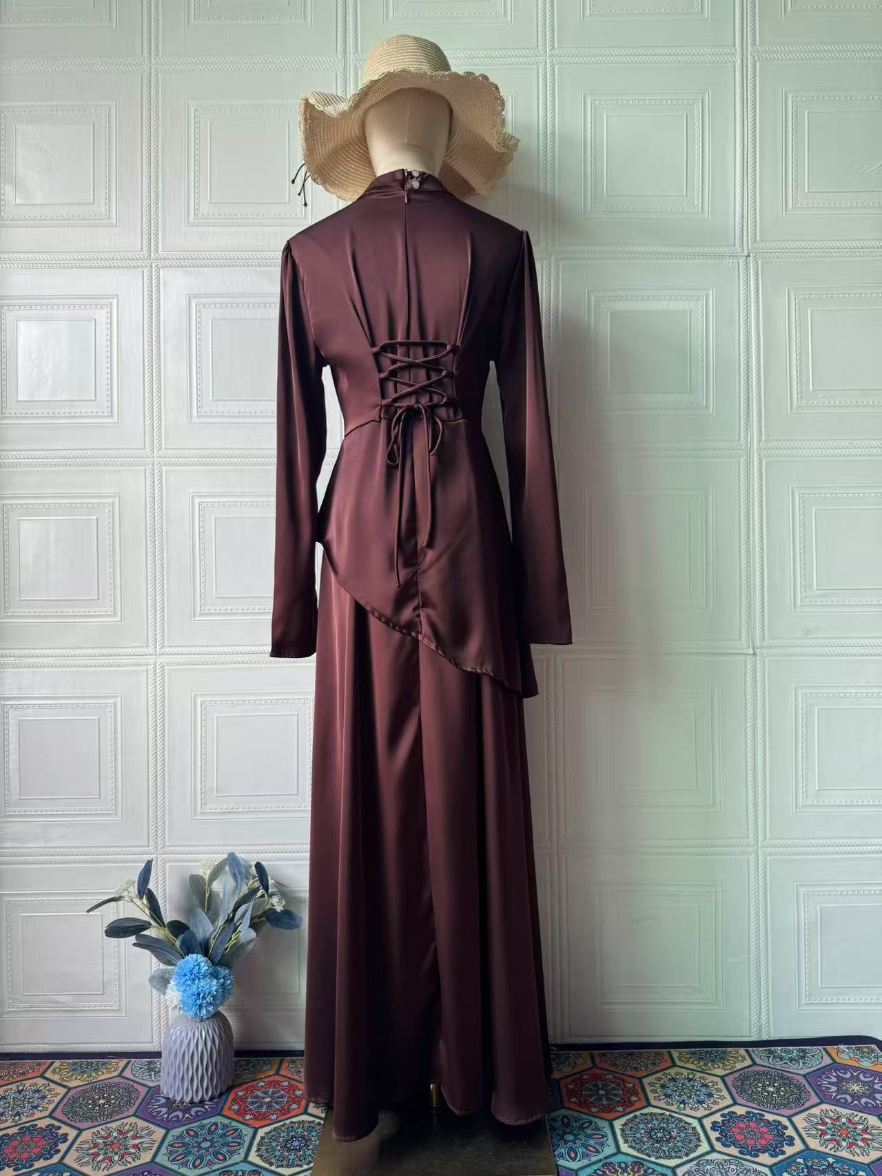 アマゾン欧米越境2025年秋 パッチワークガラスシルク風袖ロングサテンスリムワンピース