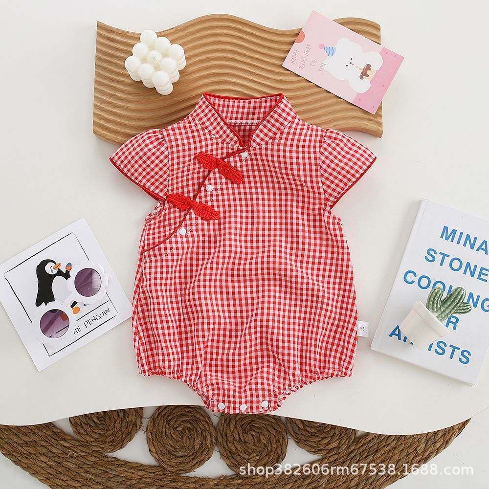 新しい赤ちゃんの夏の中国風の三角の格子のチャイナドレスは夏の薄いタイプの通気性の飛袖の連体のお尻の服を着ます。