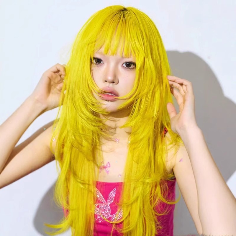 日本製レモンイエローハイレベルかわいい女性用フルヘッドウィッグ COS ロングストレートソフトガールアビフルヘッドウィッグ