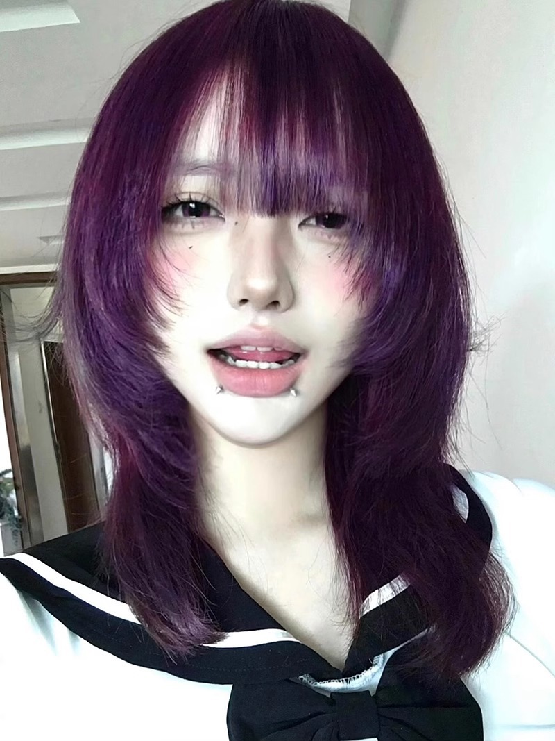假发女紫色长直发齐刘海假发化纤机制全头套wig自然蓬松cos假发jk
