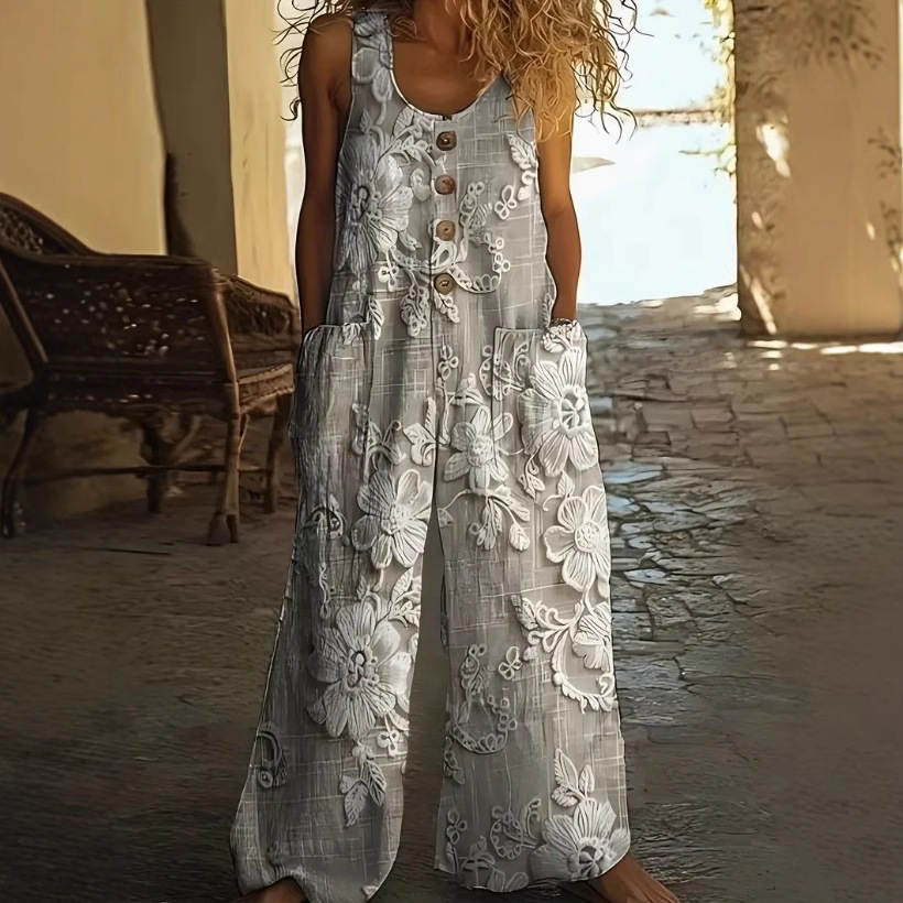 2025 ヨーロッパとアメリカのクロスボーダーレディース夏カジュアル花柄ノースリーブラウンドネックボタンワイドレッグポケットジャンプスーツ