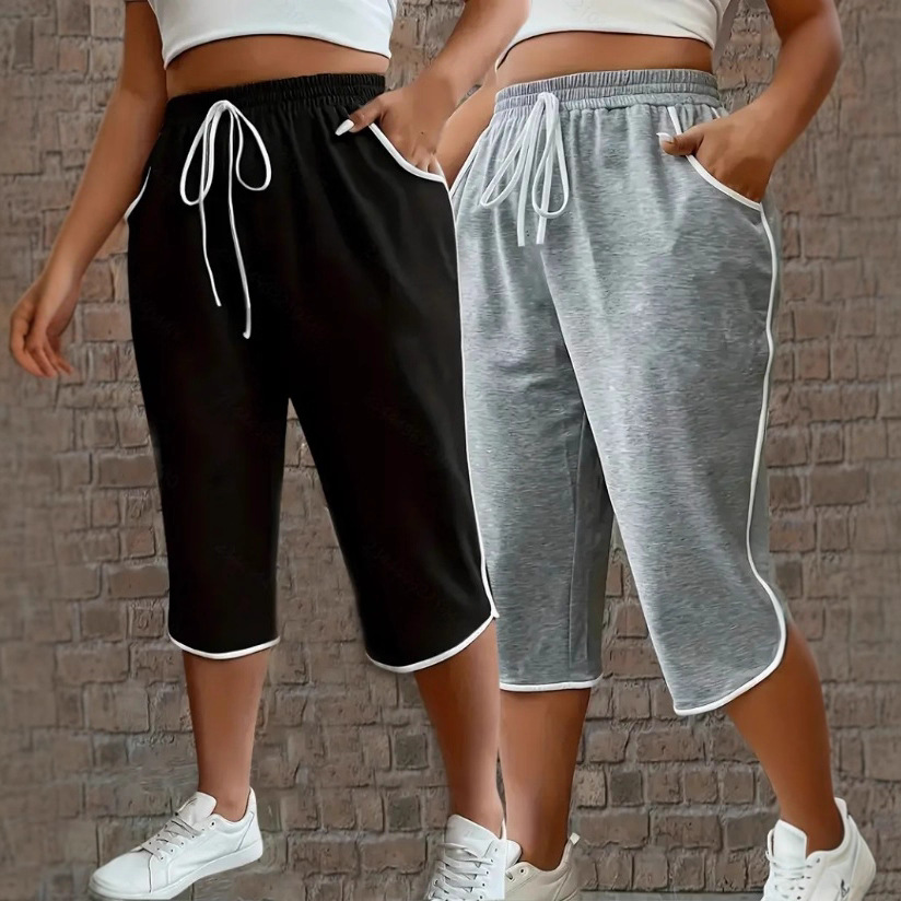 2025 ヨーロッパとアメリカのクロスボーダー大きいサイズウィッシュ AliExpress 新しい 2 ピースコンビネーションコントラストカラースポーツカジュアルクロップドパンツ夏