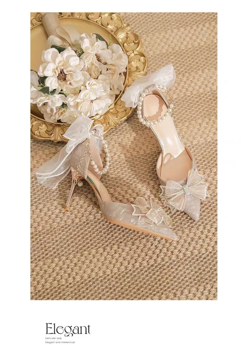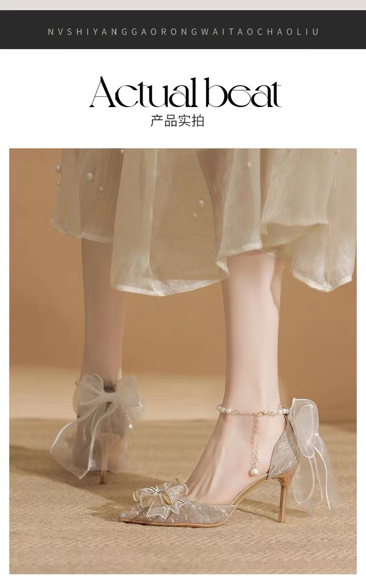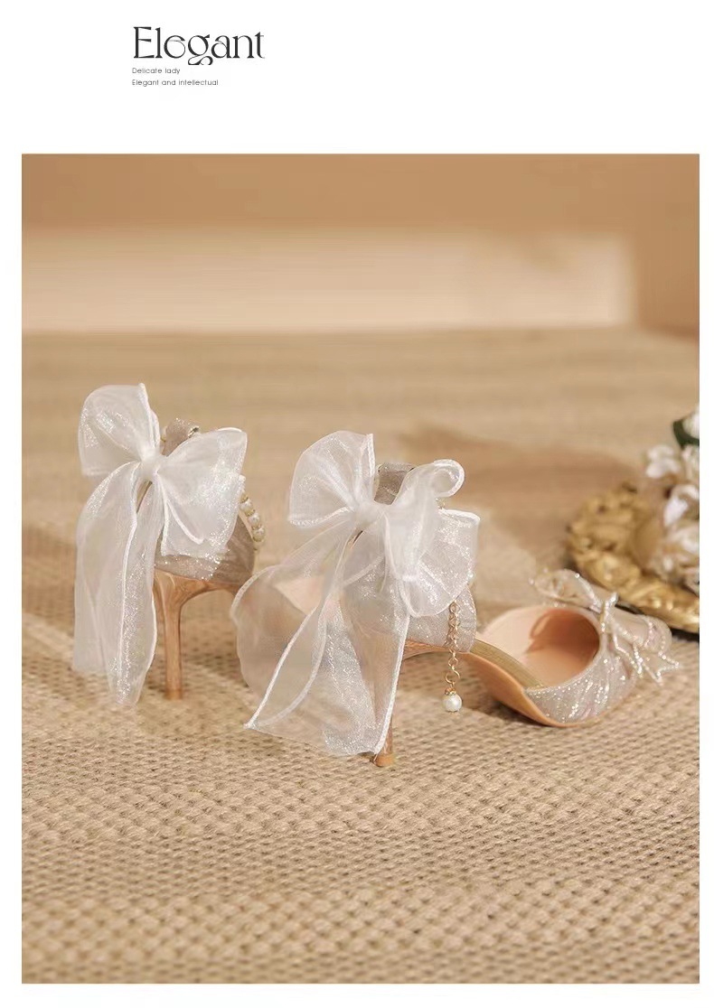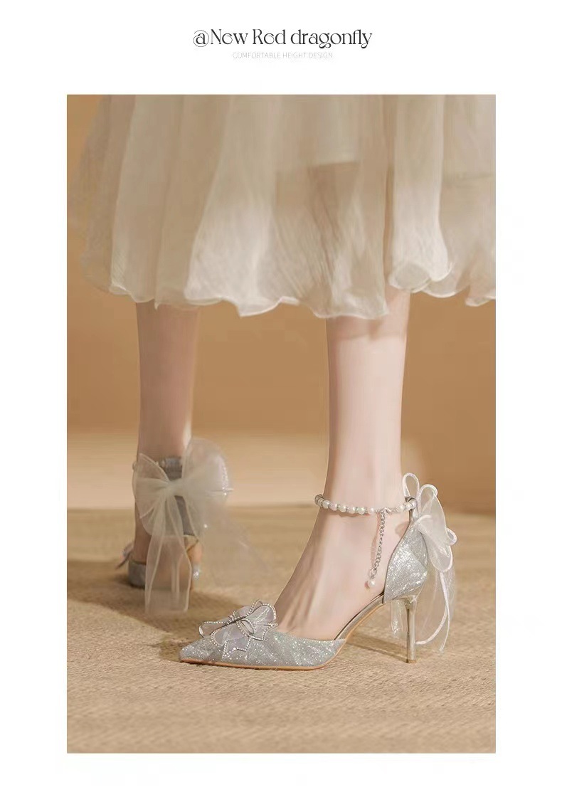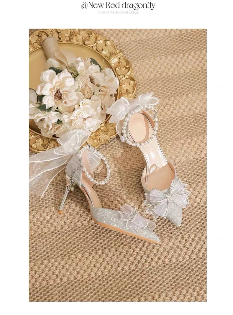 ハイヒール2025年の新型の尖ったスパンコール蝶結びの中空靴の結婚式の靴の花嫁の靴の尖った靴