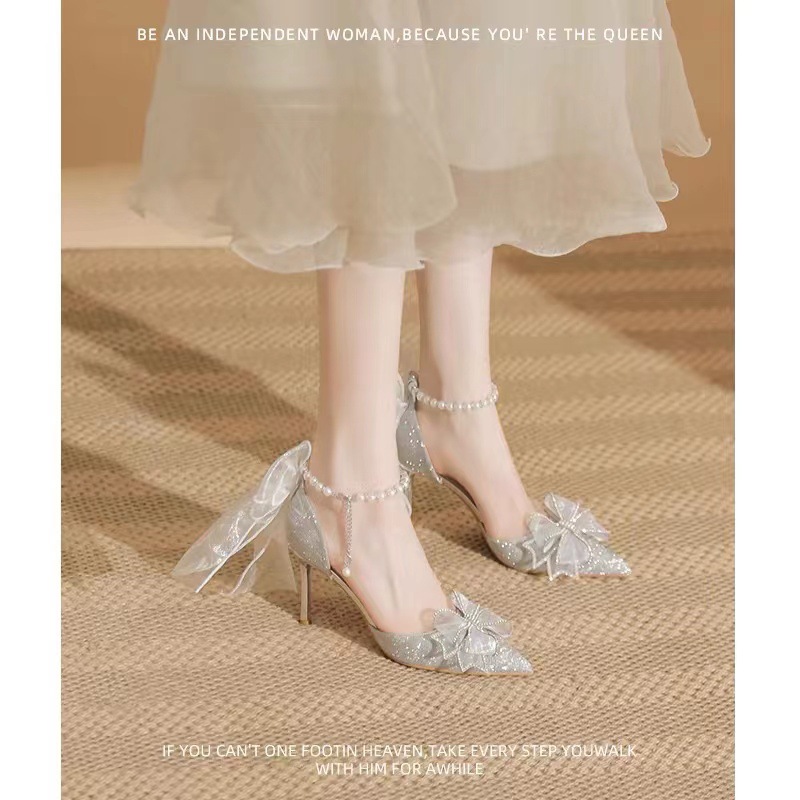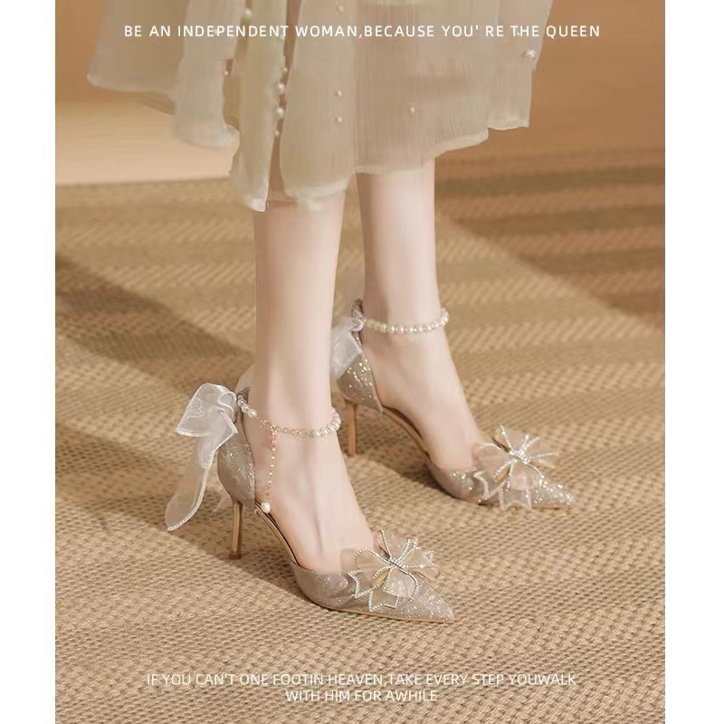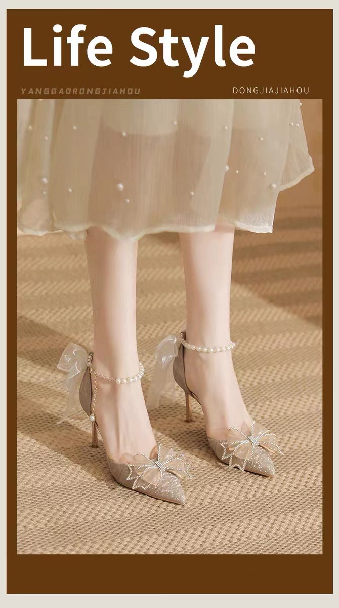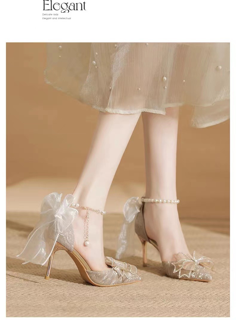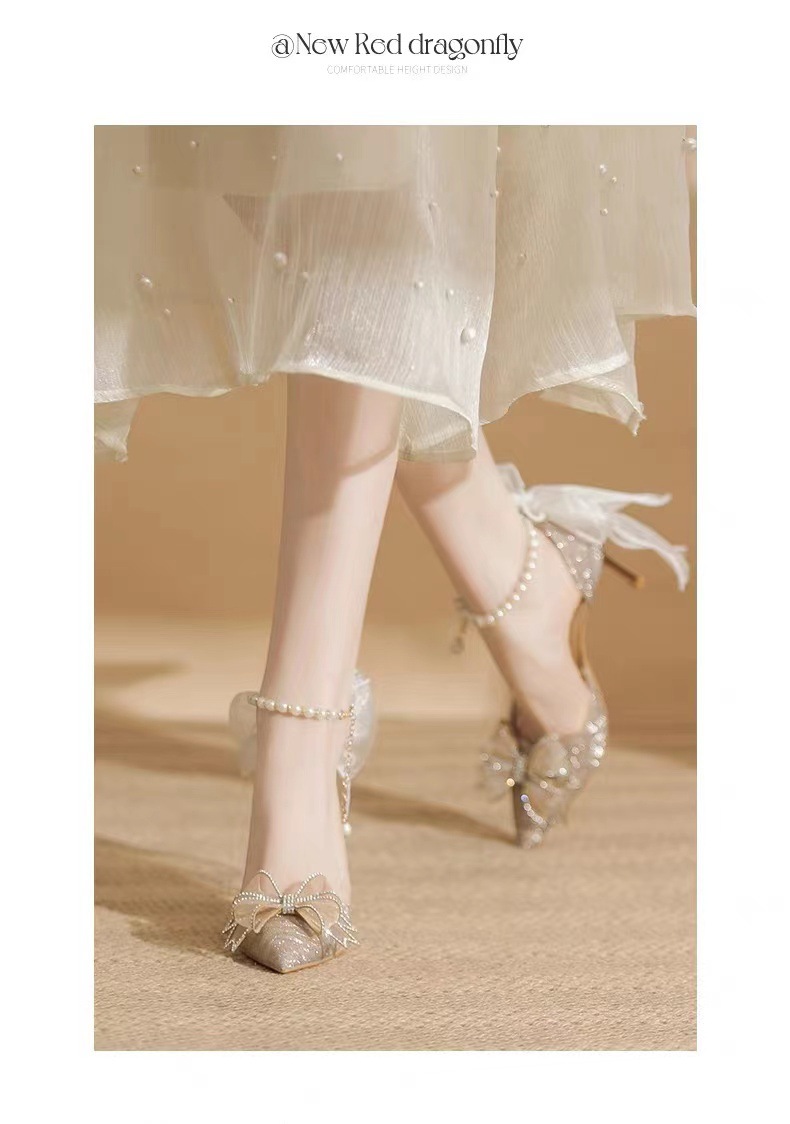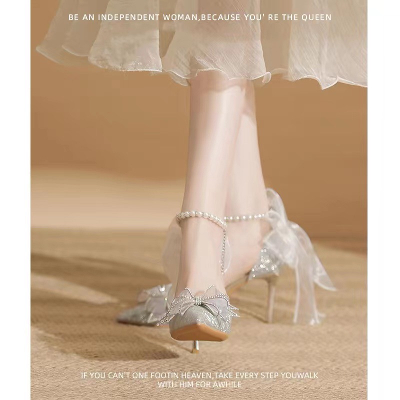 ハイヒール2025年の新型の尖ったスパンコール蝶結びの中空靴の結婚式の靴の花嫁の靴の尖った靴