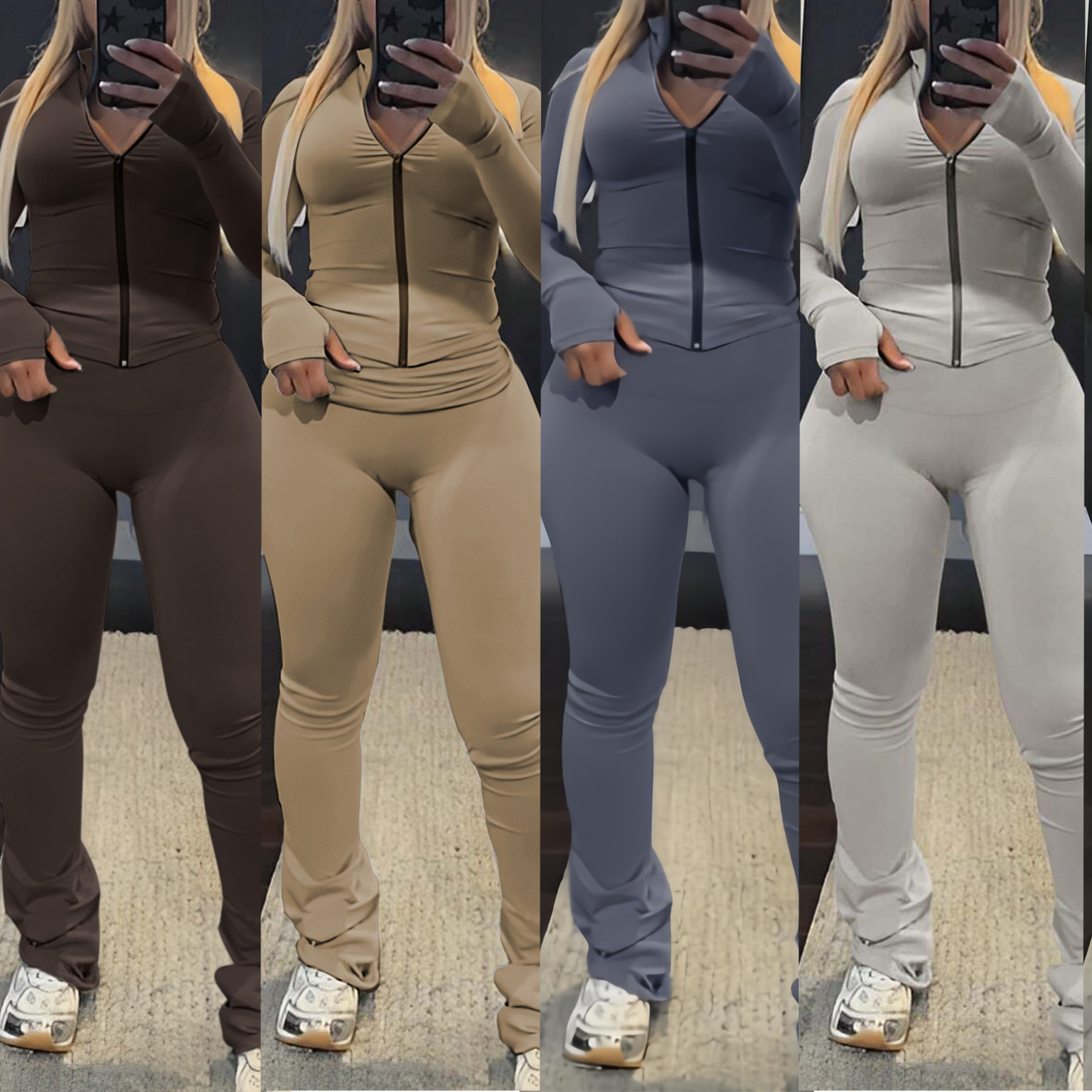 LD2236跨境欧美女装亚马逊开衫拉链小立领时尚休闲修身套装