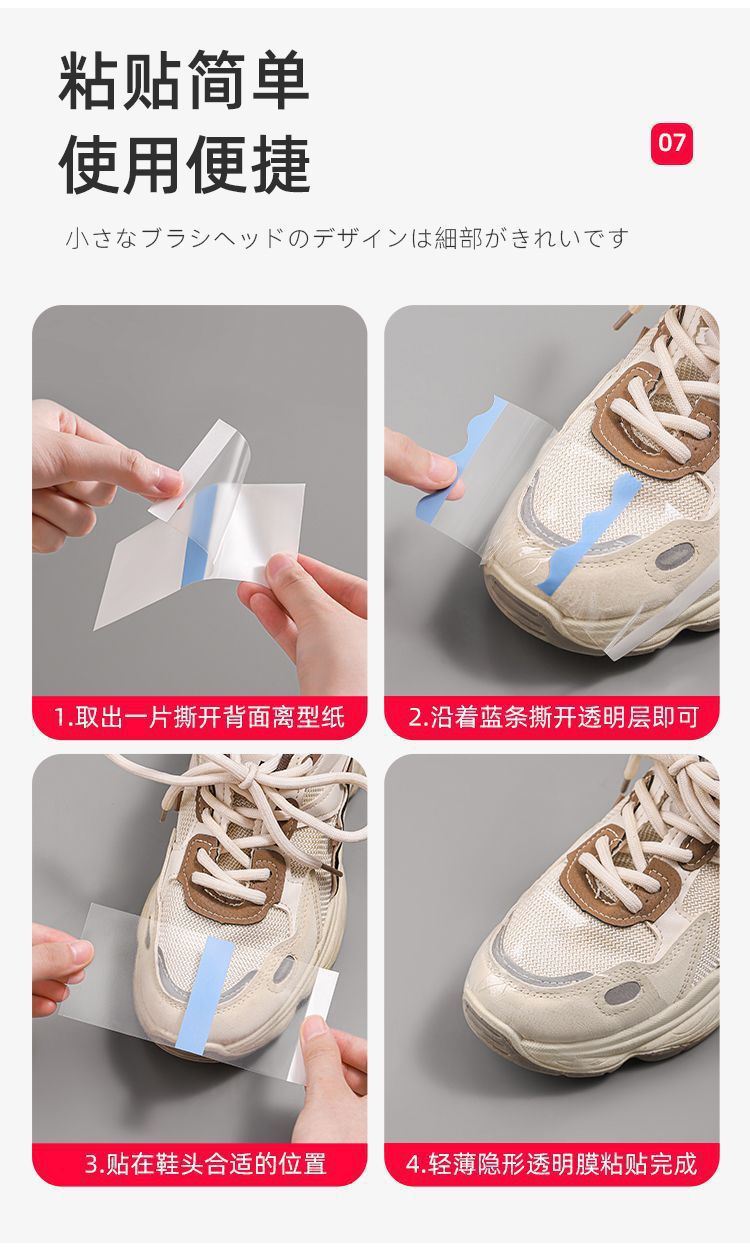 靴の先の汚れ防止膜雨の日の靴の先の防水は靴の先のきれいなシールを貼って雨の日の隠れた防水膜を貼ります。