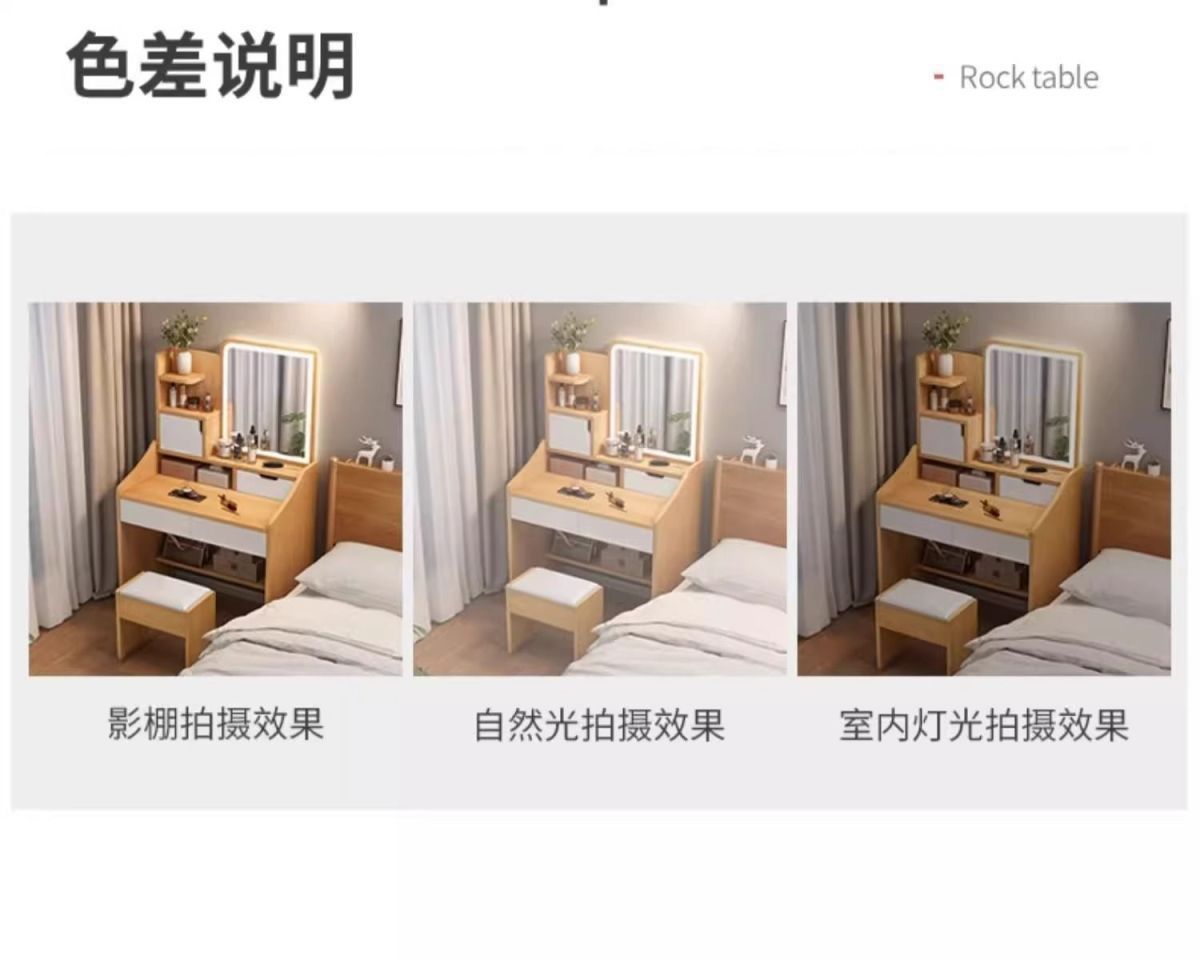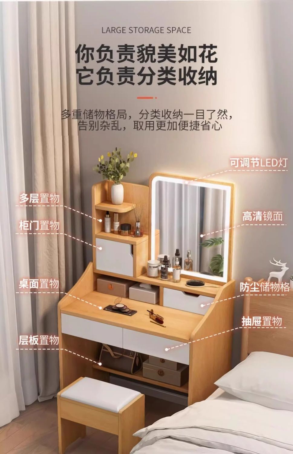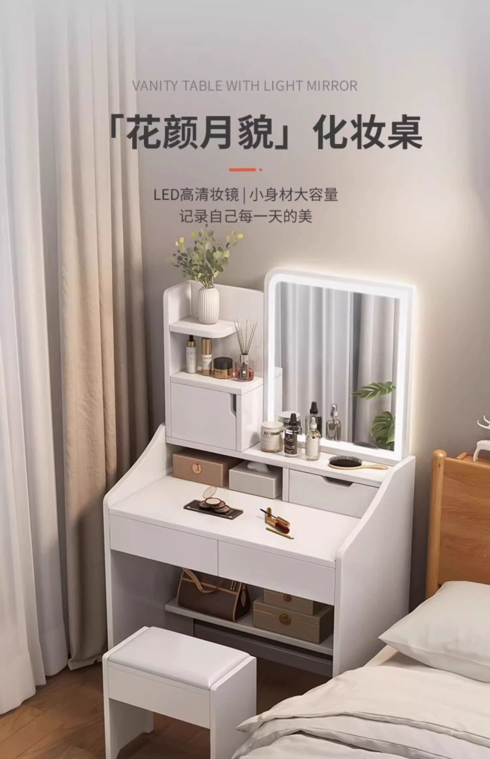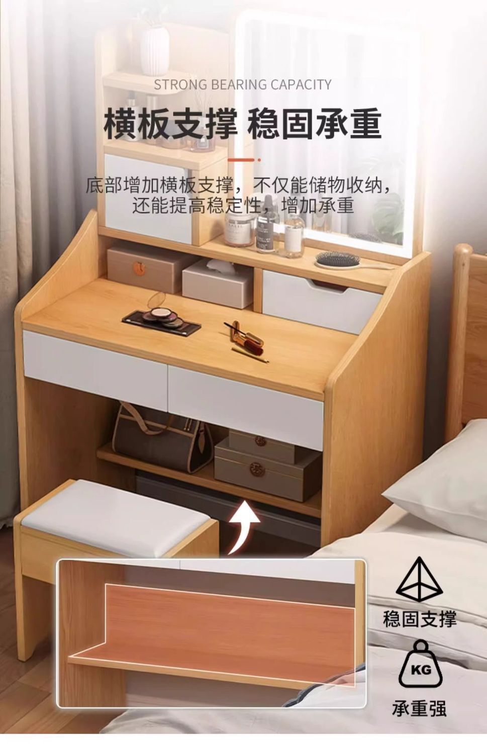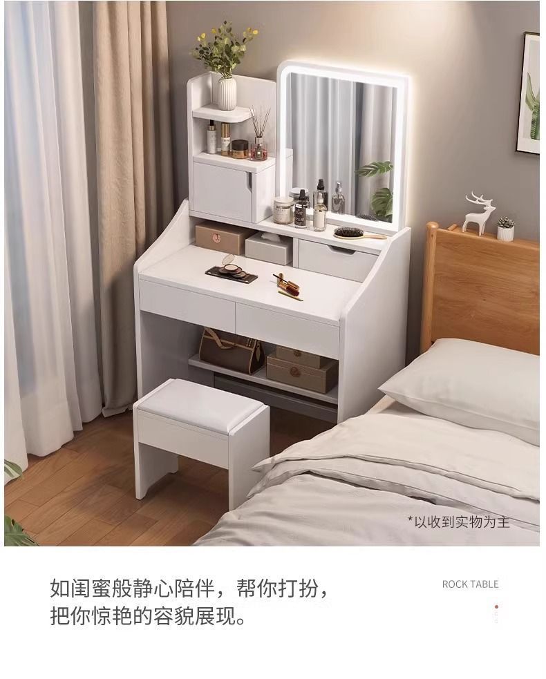 タンブ付き、化粧スツール付き、鏡付き、収納付き、ベッドサイドテーブル付き