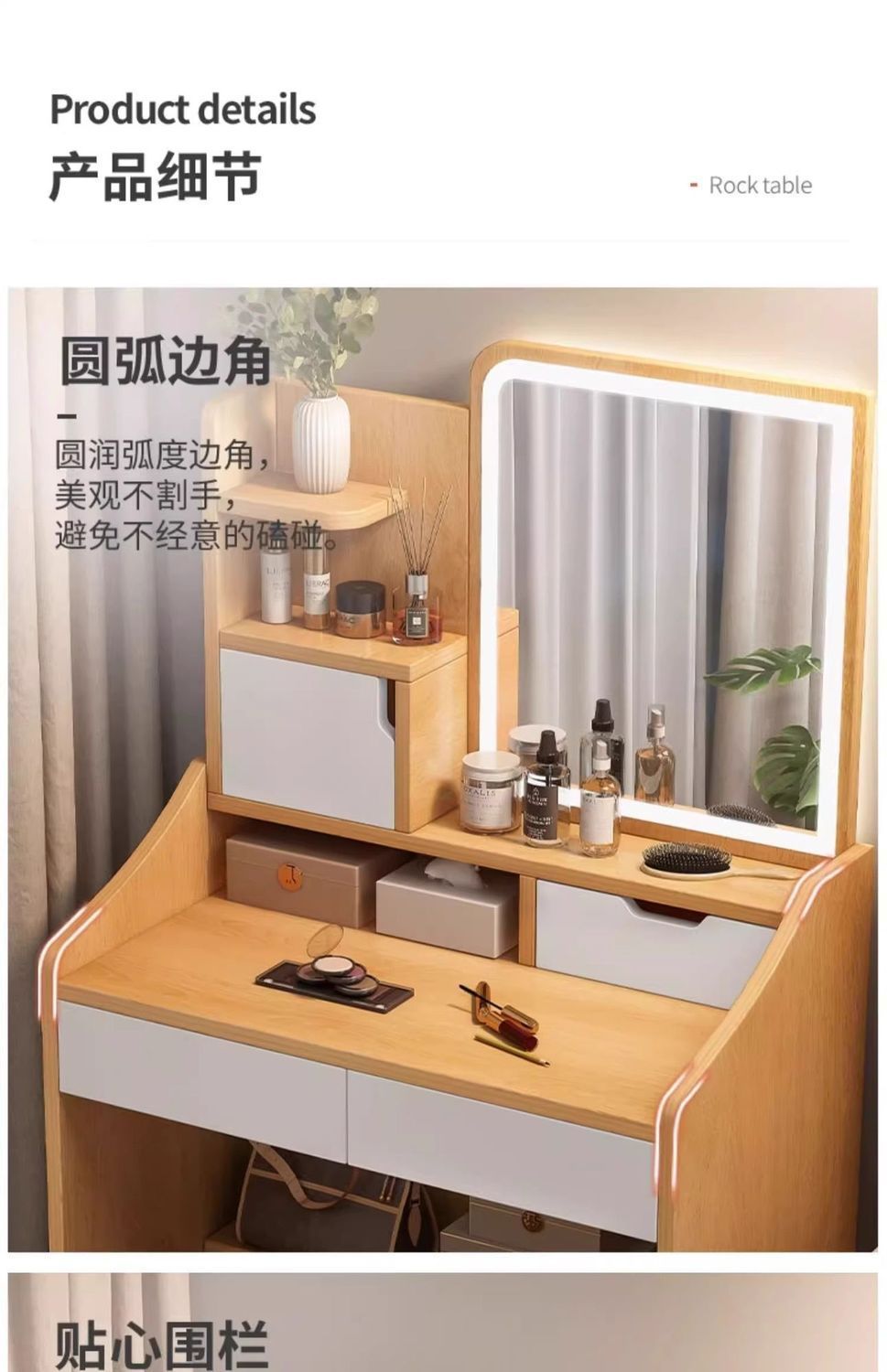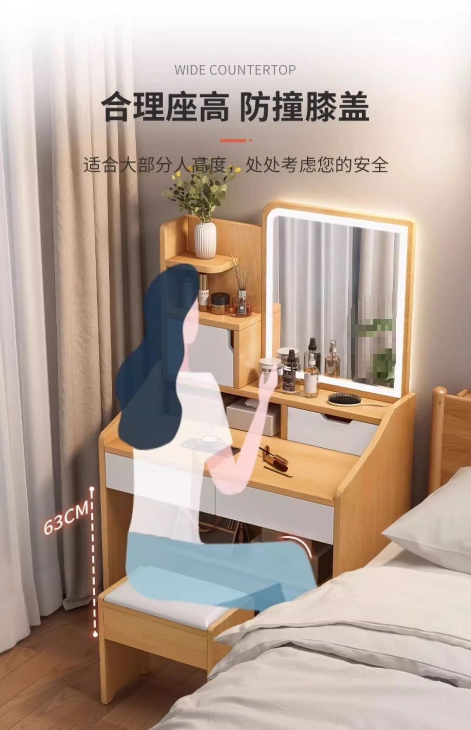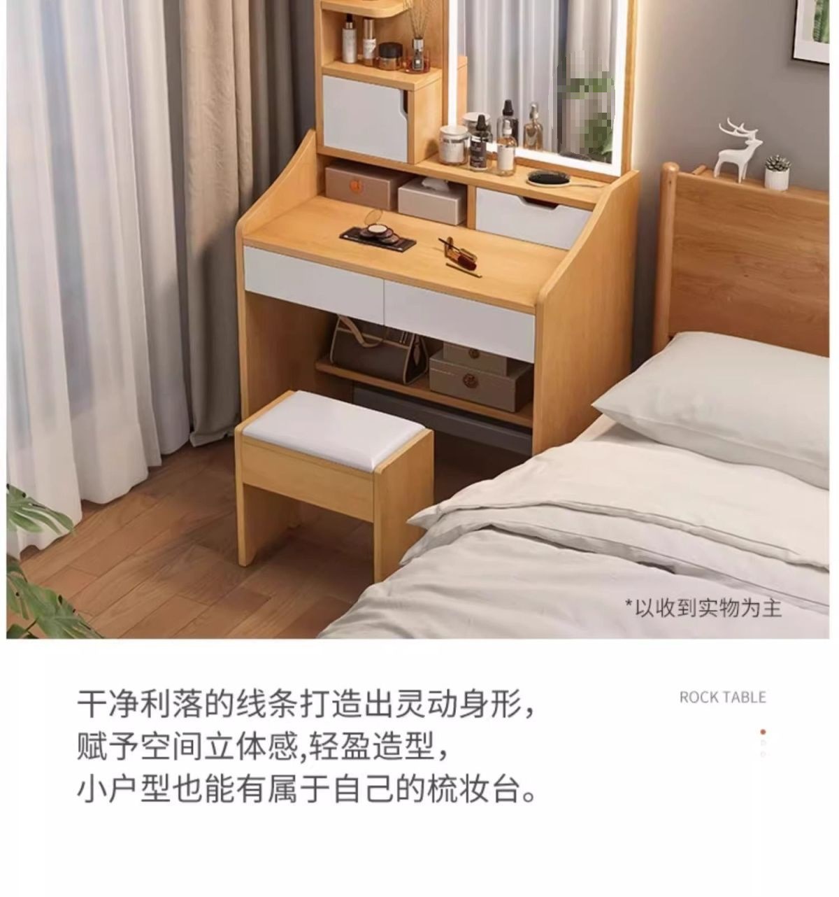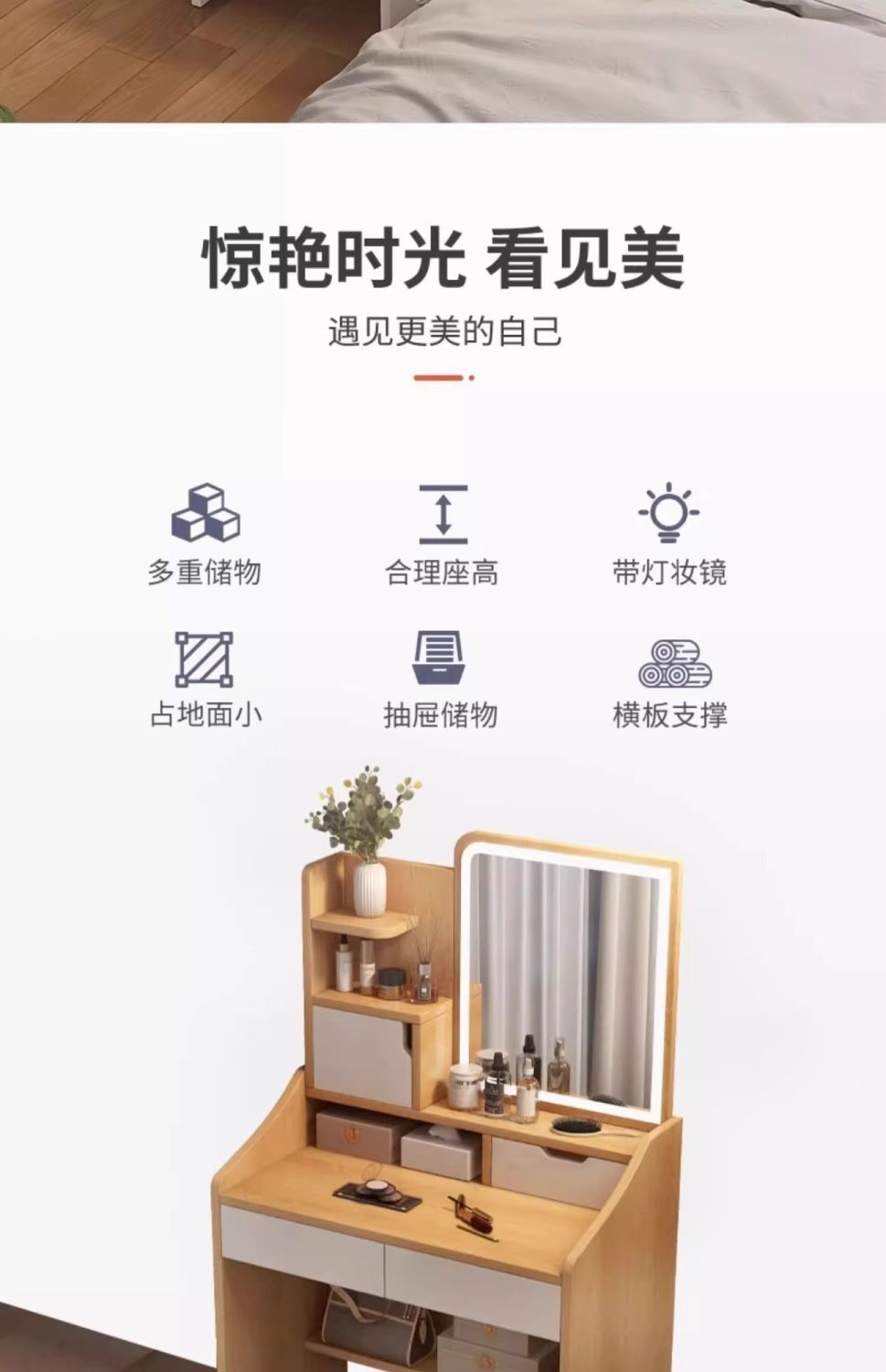 タンブ付き、化粧スツール付き、鏡付き、収納付き、ベッドサイドテーブル付き
