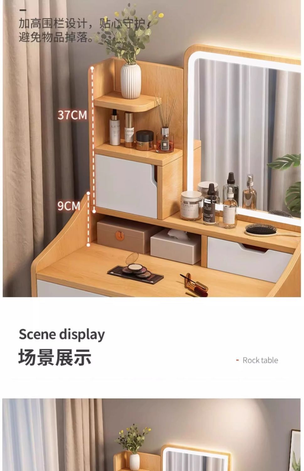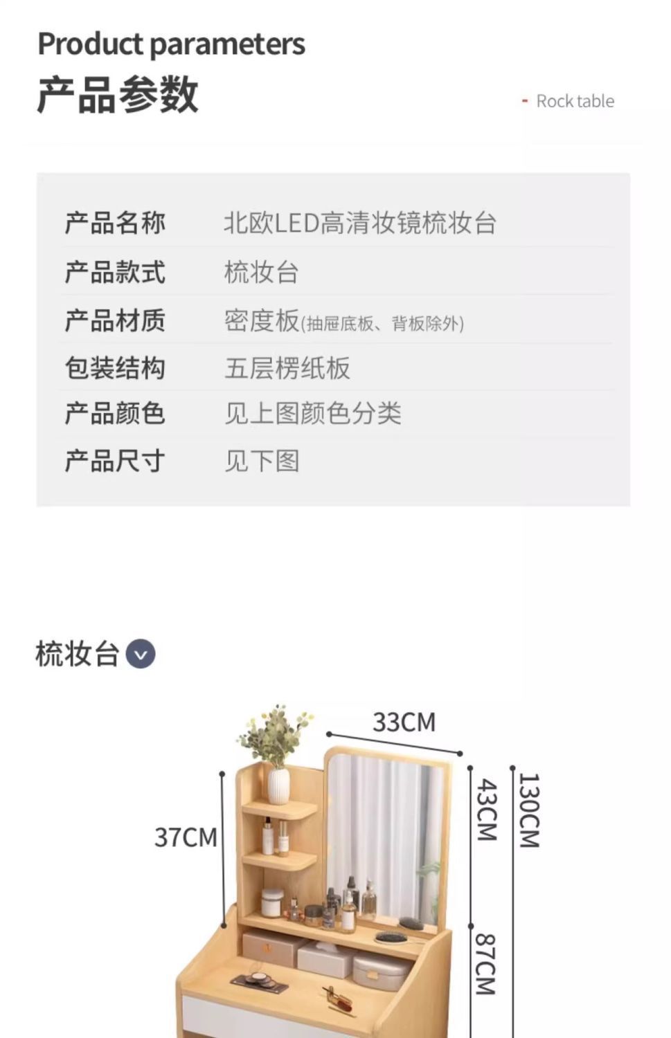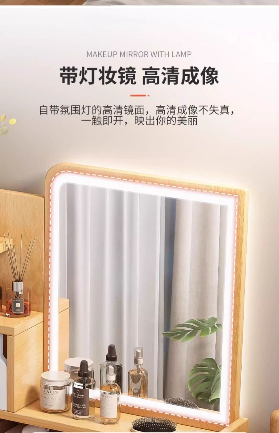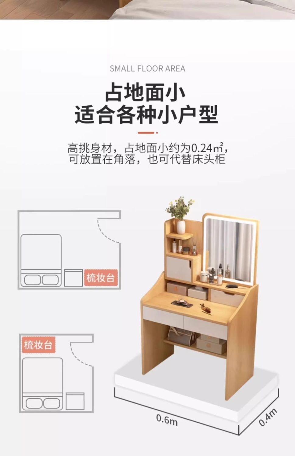 タンブ付き、化粧スツール付き、鏡付き、収納付き、ベッドサイドテーブル付き