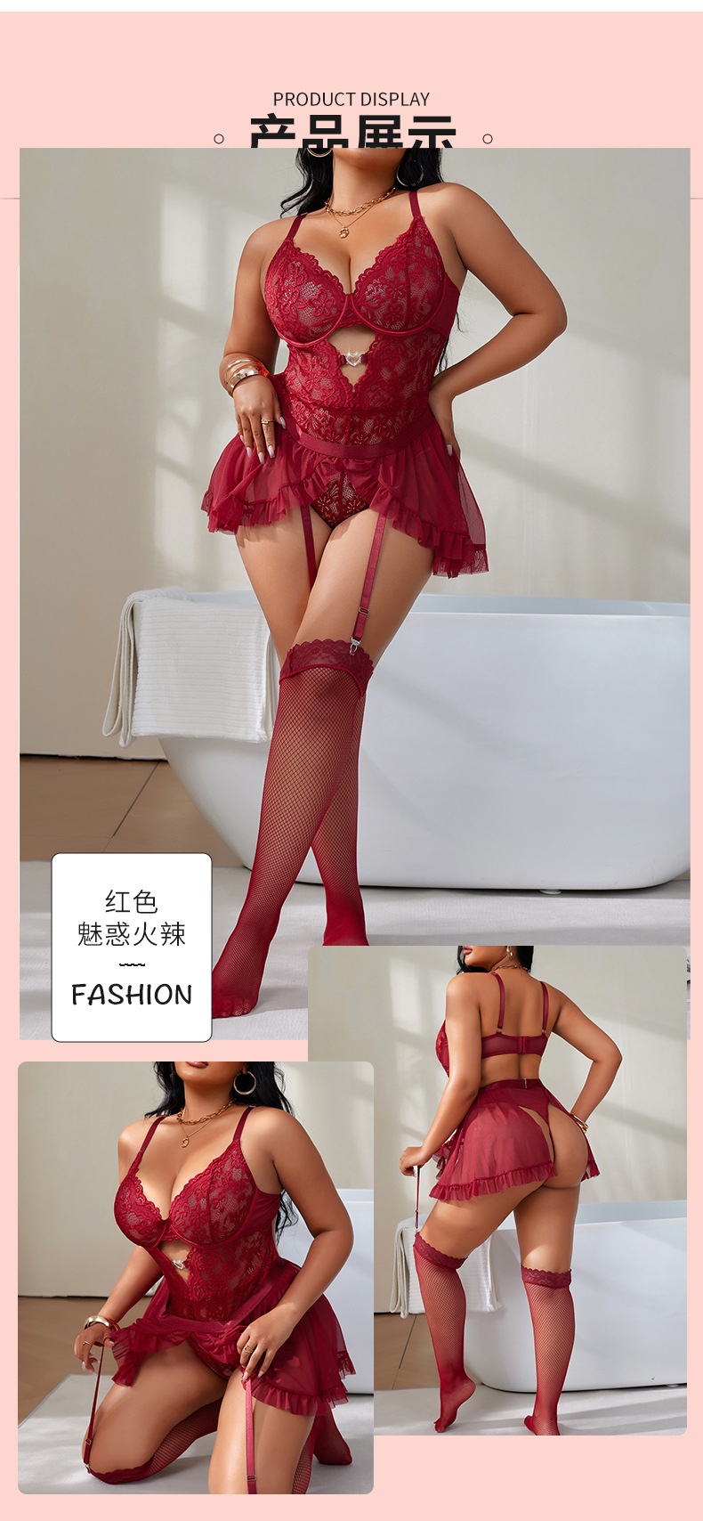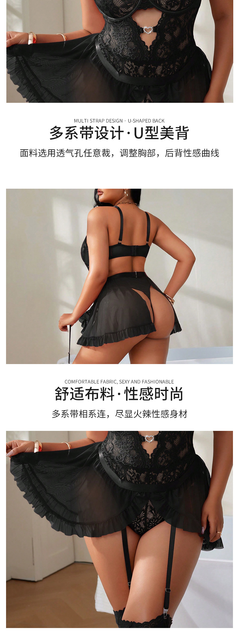 欧米風大きいサイズ透かし彫りシースルーワンピースランジェリーセクシーレースガーター付きホットなキャミソールパジャマセット