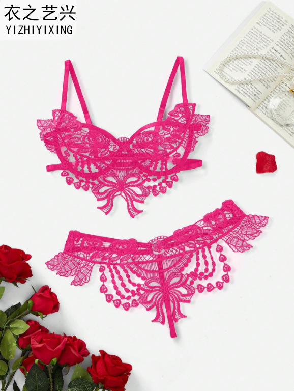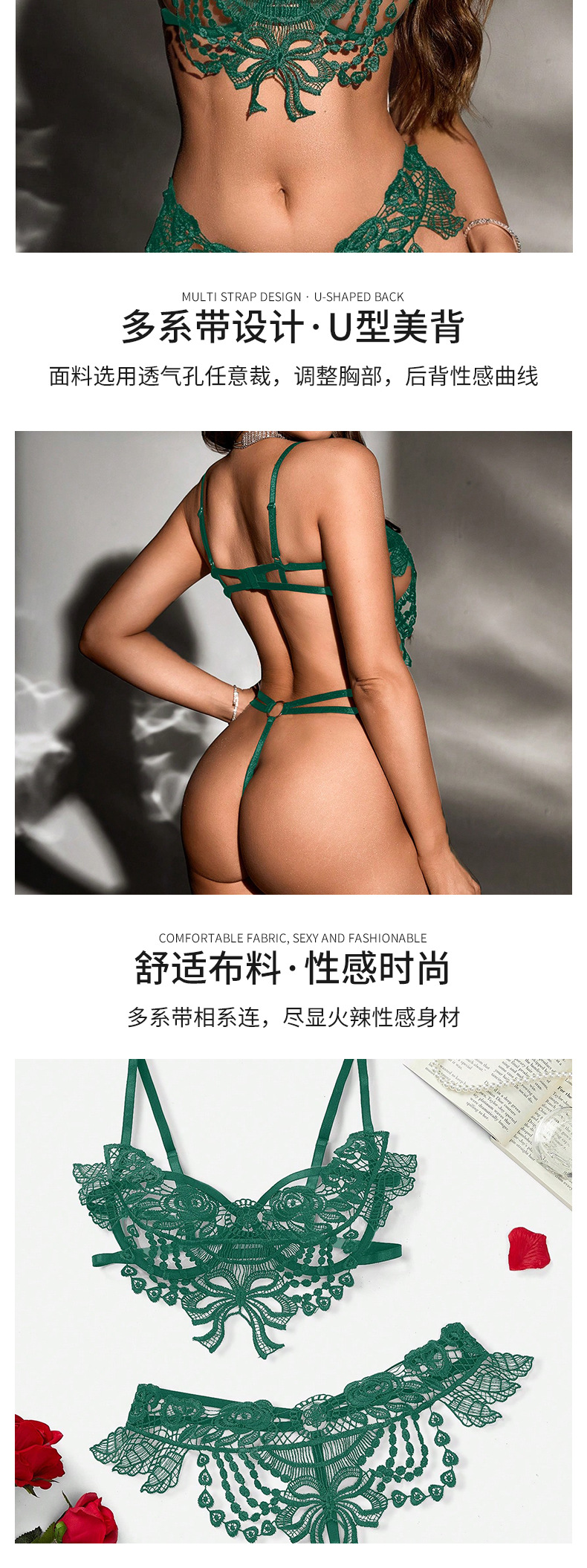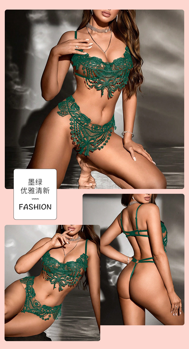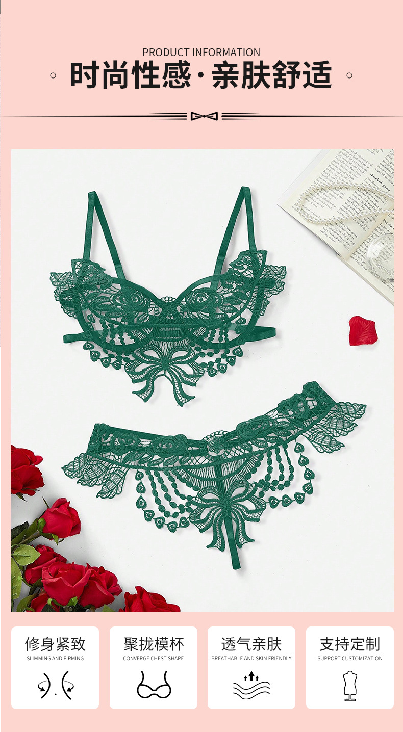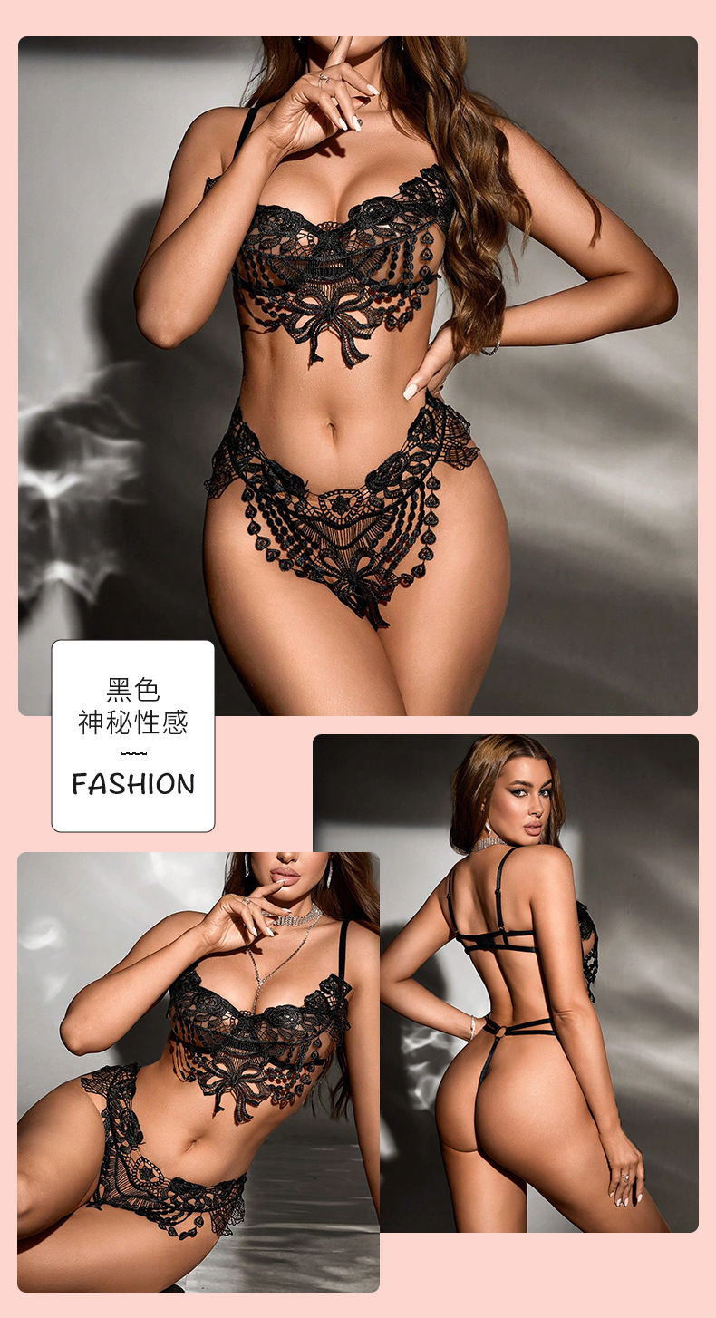 欧米風セクシーレースランジェリーセット、Tバック、刺繍入りシースルー下着、細ストラップ、背中見せ、透かし彫りセット