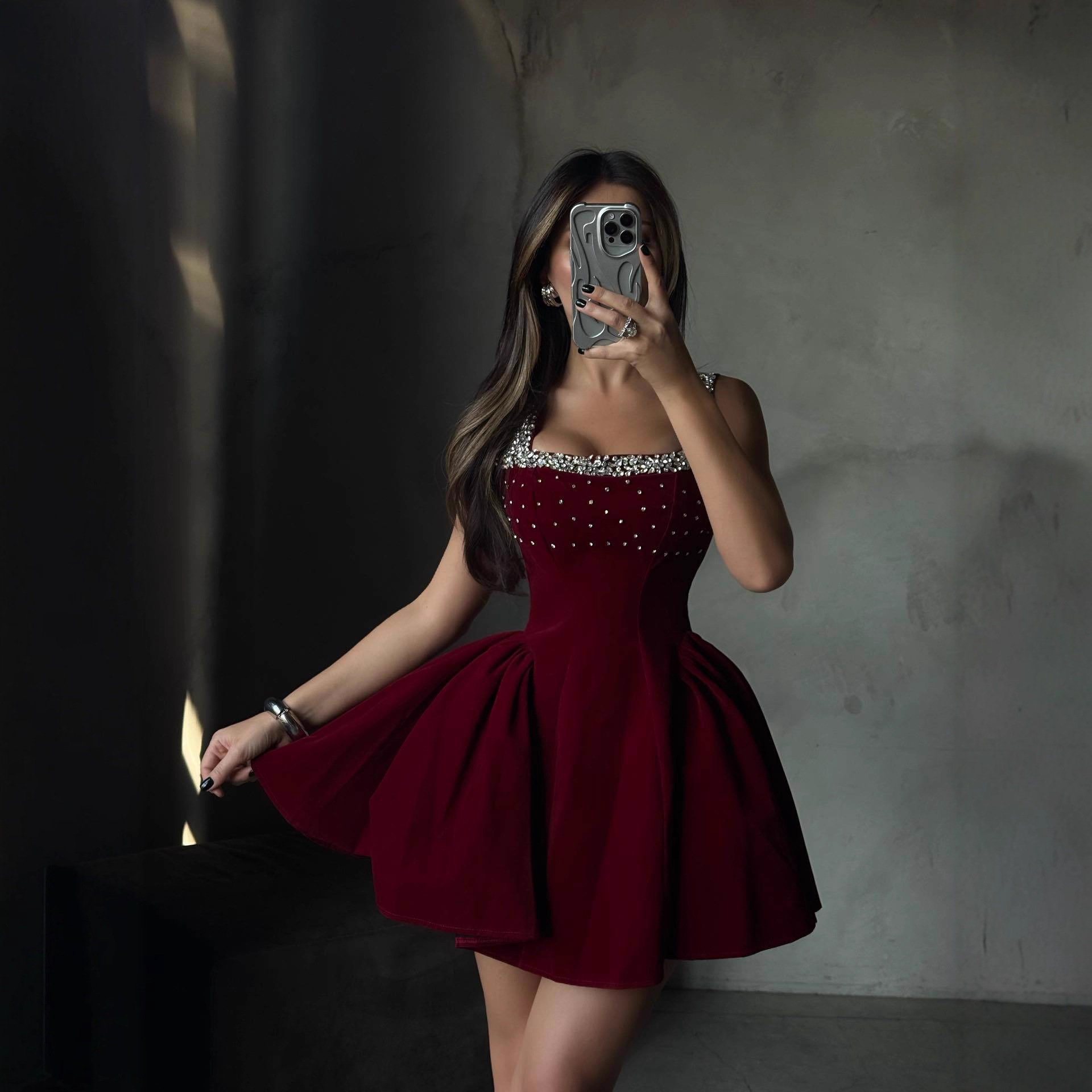 法式小香风新款重工镶钻收腰蓬蓬连衣裙女春夏季气质收腰吊带短裙