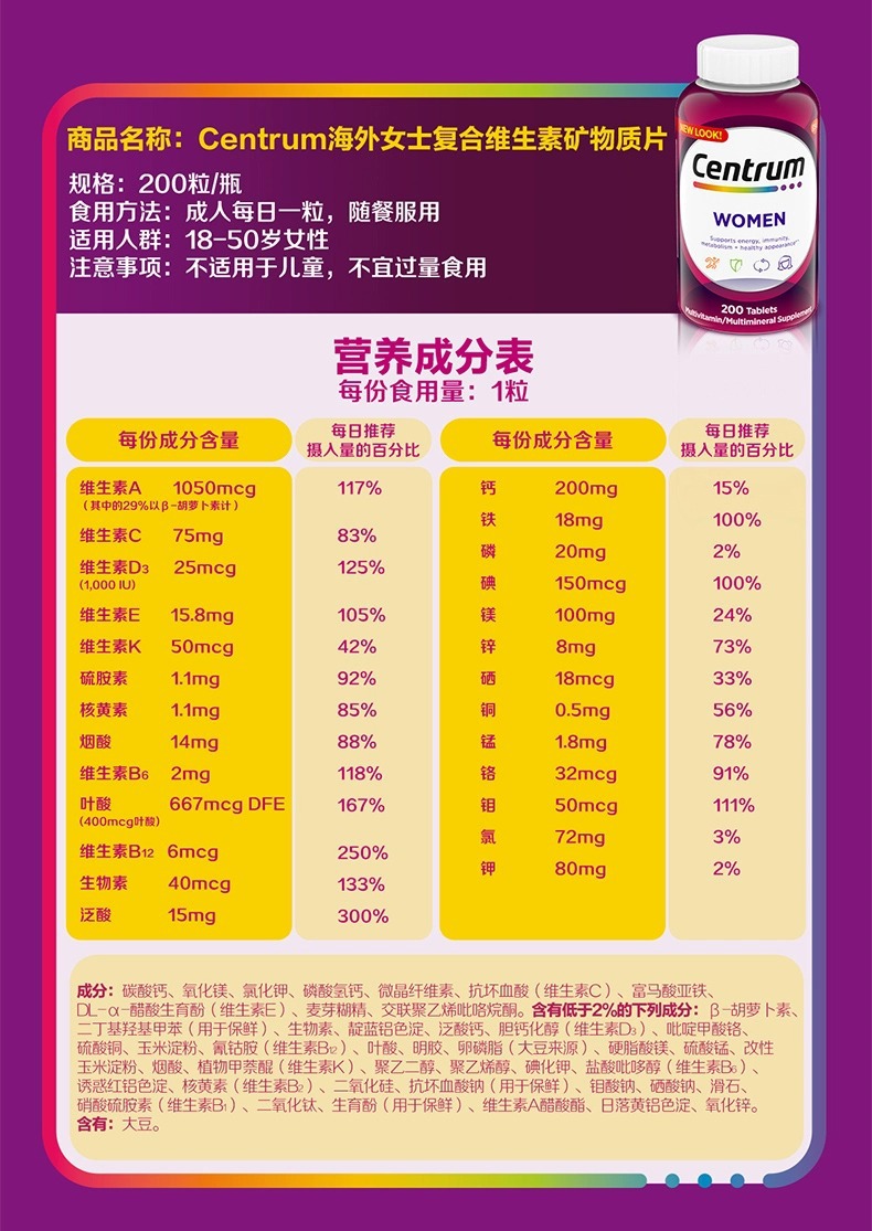 美国原装进口复合维生素女士50+ 275粒矿物质中老年片