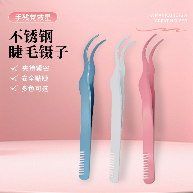 ステンレスのまつげピンセットは櫛を持って補助器を挟みます。