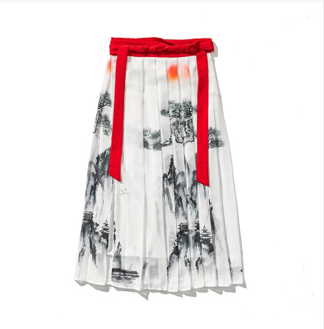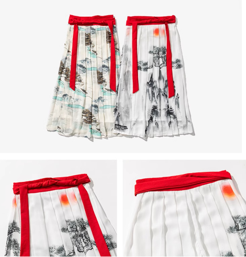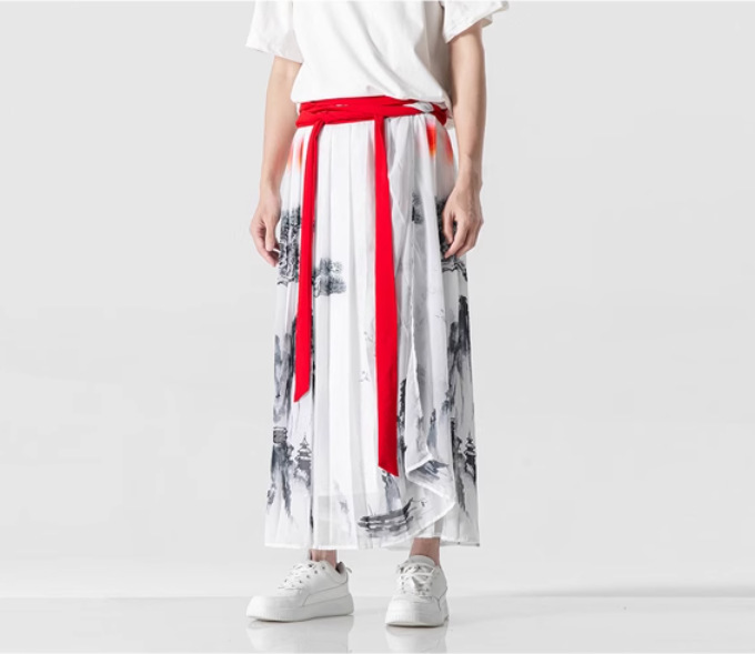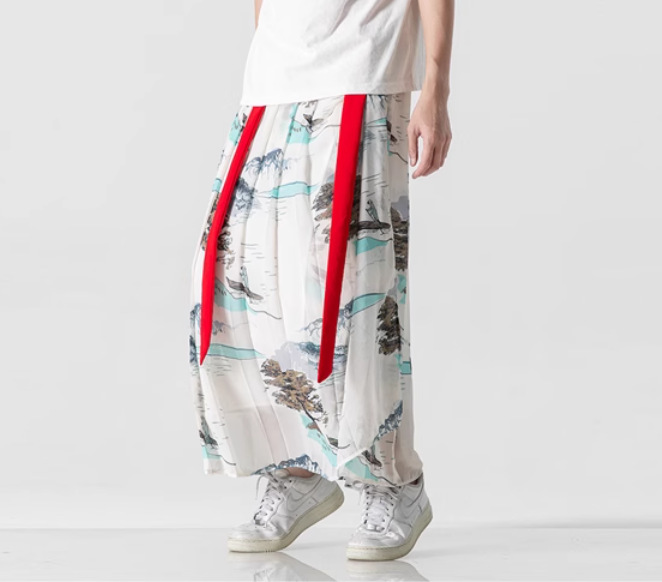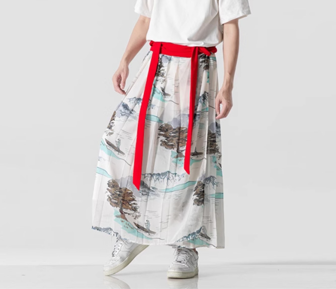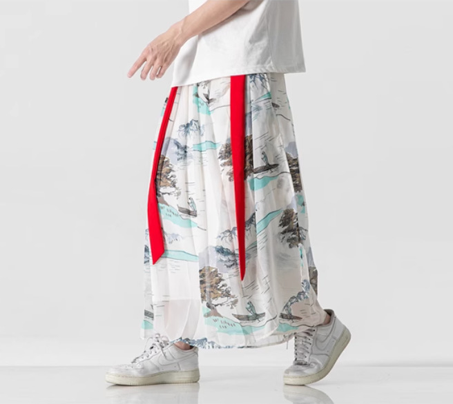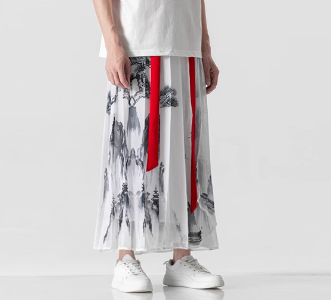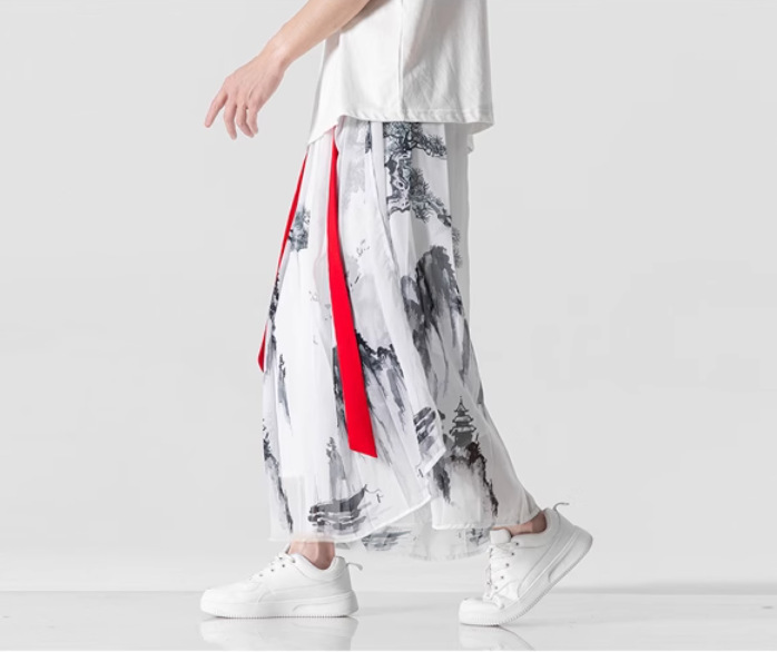 25 夏通気性アイスシルク薄型メンズ中国風カジュアルエレガントなプリント馬面スカートメンズレトロ漢服宋パンツ