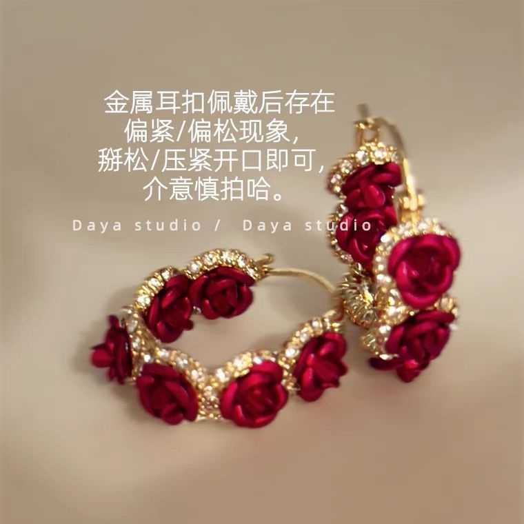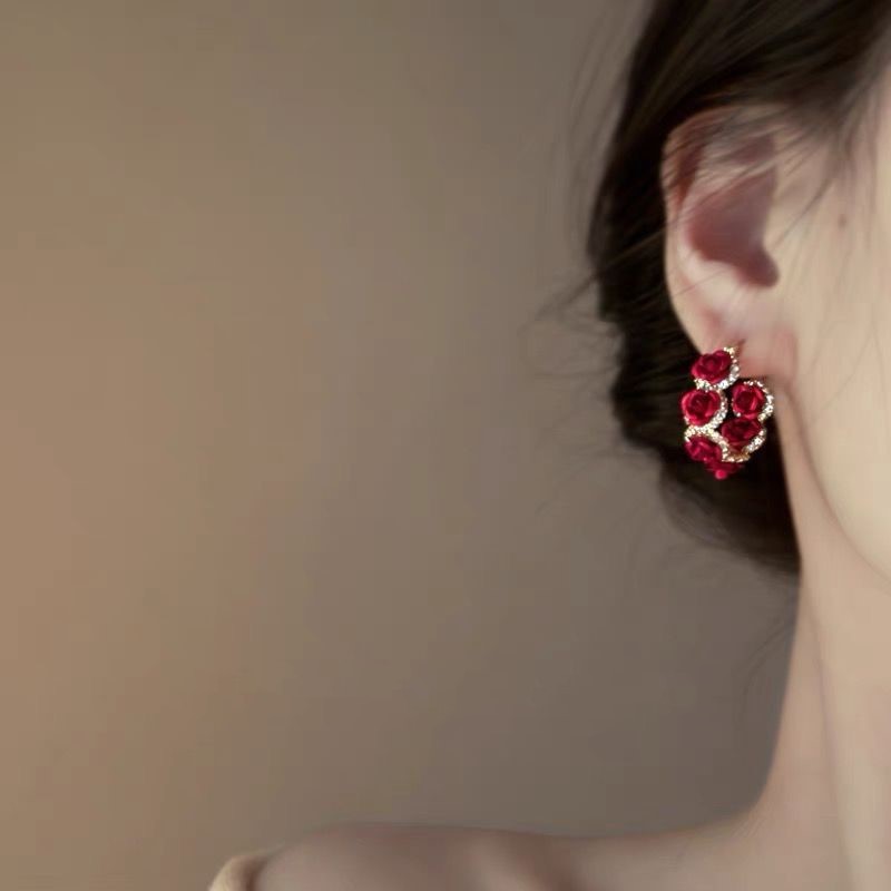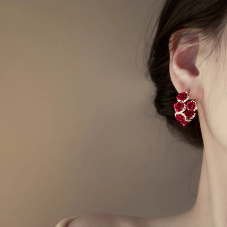 ローズの神様、ロマンチックなフレンチレトロな赤い花のダイヤモンドピアス、軽い贅沢、ハイエンドのニッチな気質
