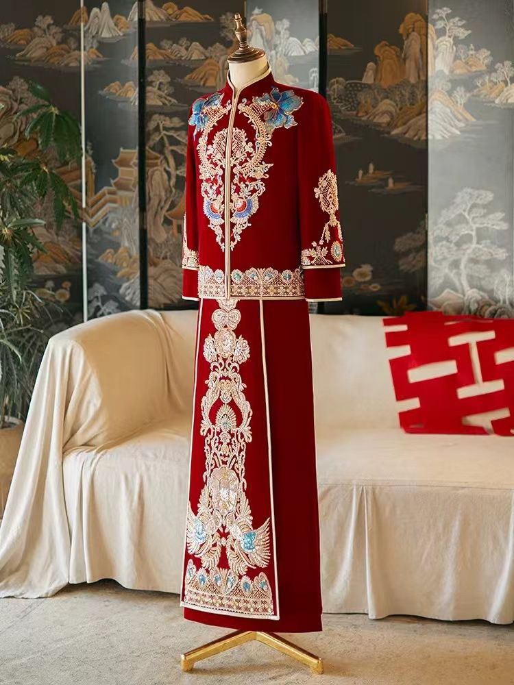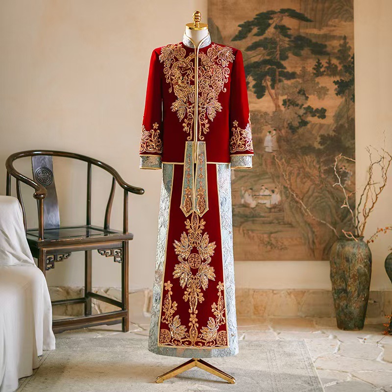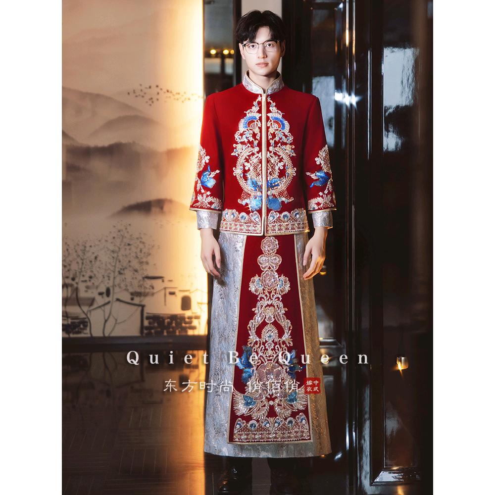 メンズ秀禾服酒紅色ベルベット礼服2025中式婚礼服龍鳳服唐服迎親男性服漢服