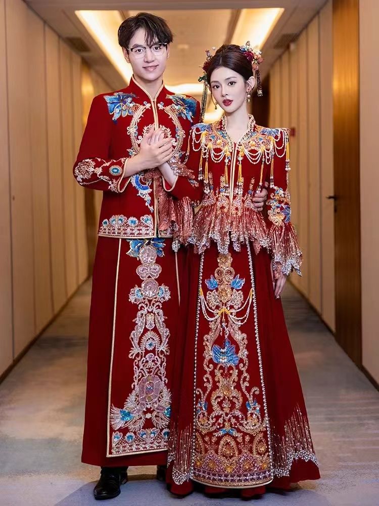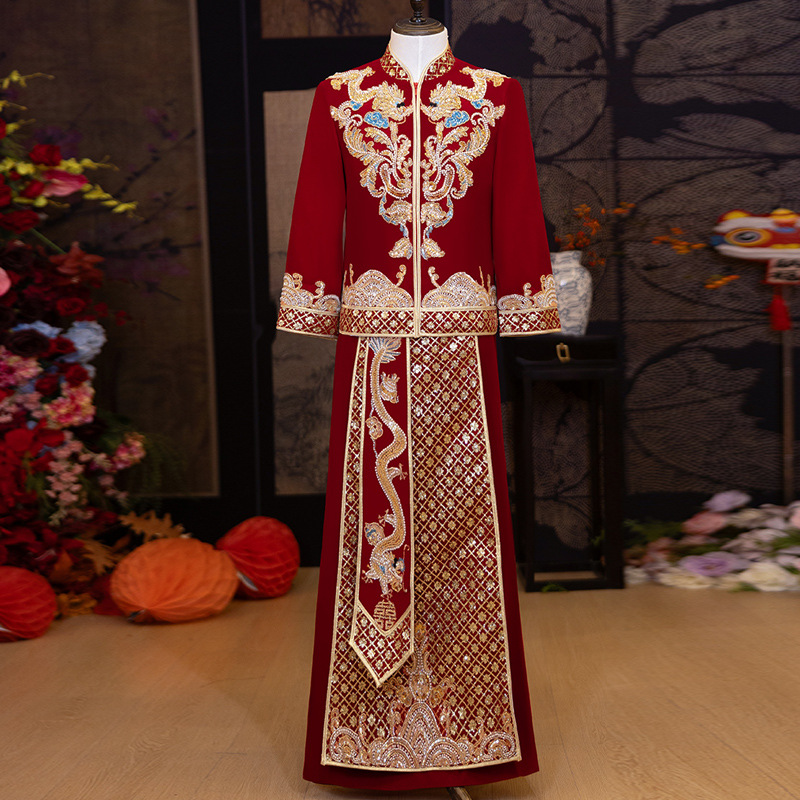 Xiuhefu 紳士服新郎着用 2025 新中国風の結婚式のドレス男性の乾杯服唐装龍と鳳凰のガウン結婚式