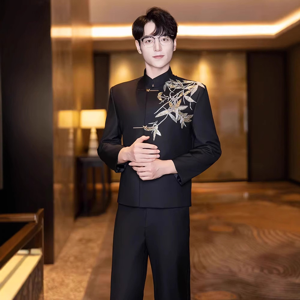 メンズ新中式中山服新郎男性用礼服唐装スーツジャケットセット中国風刺繍