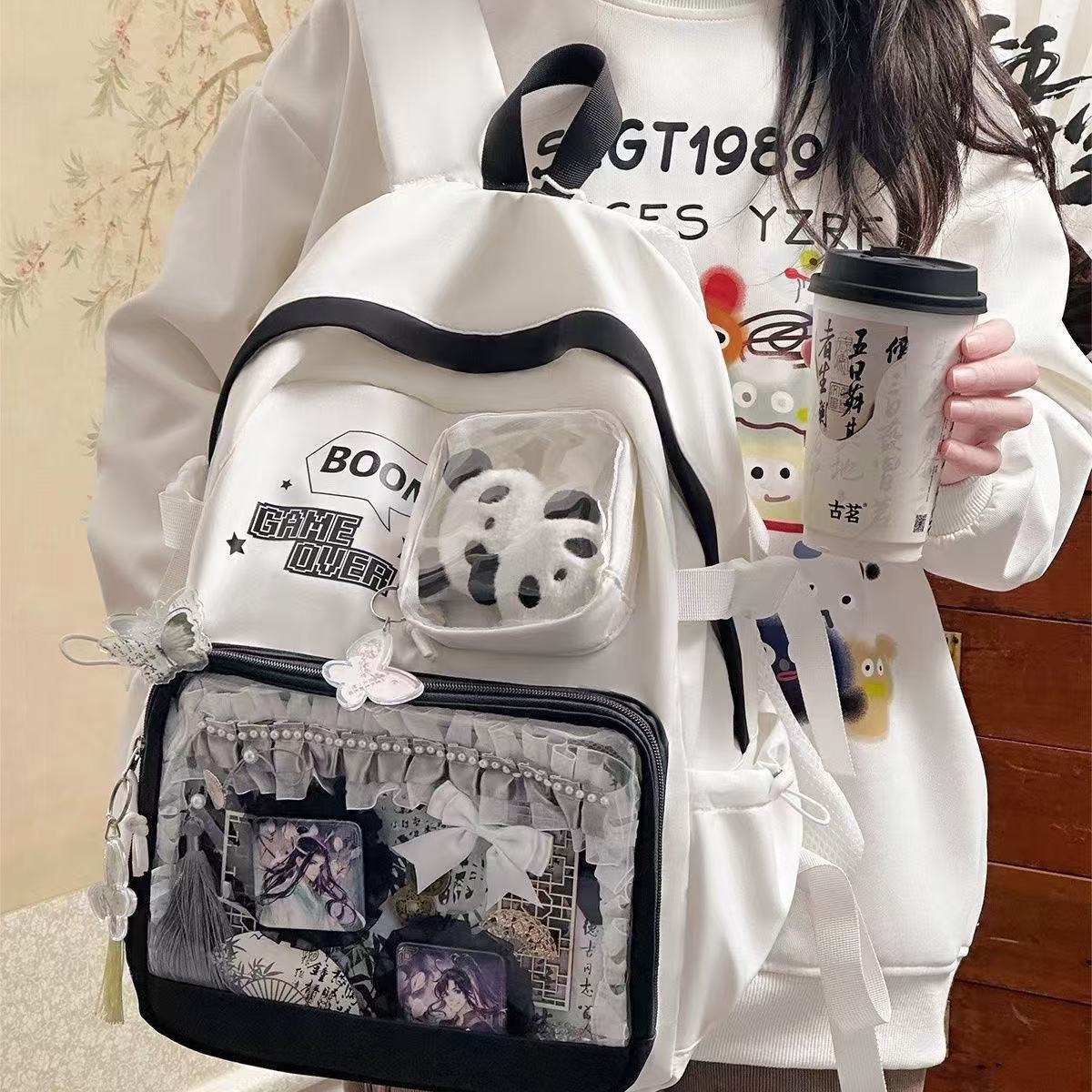 黒と白のリゾートバックパック、痛バッグ、二次元透明穀物大容量バックパック、中学生女子スクールバッグ、女性