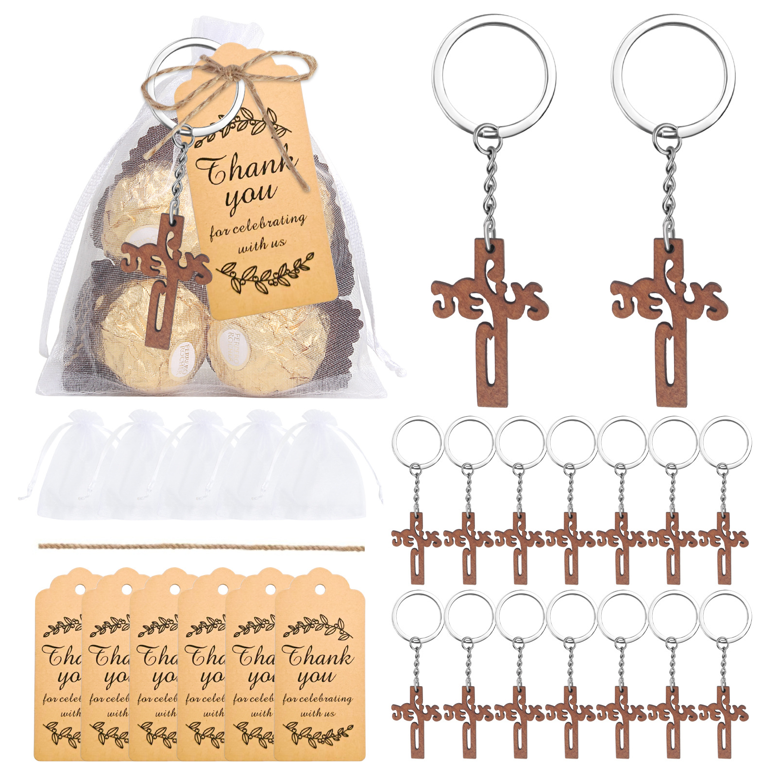 跨境新款木牌十字架钥匙扣派对圣餐洗礼礼品牛皮纸标签和欧根纱袋