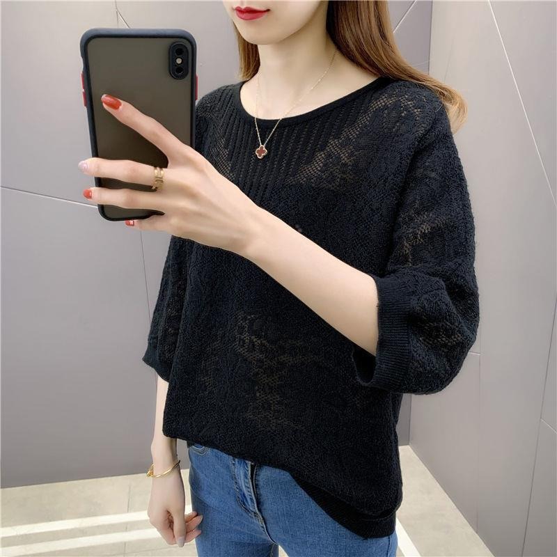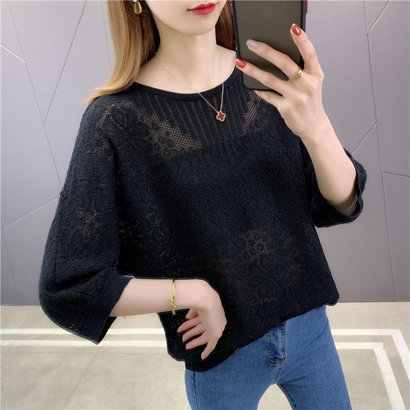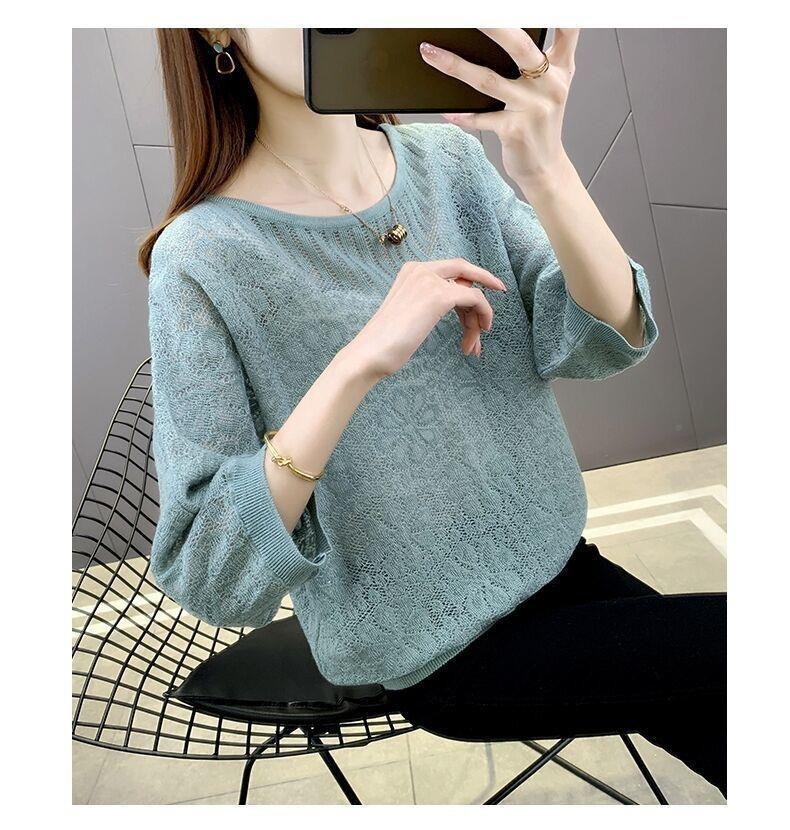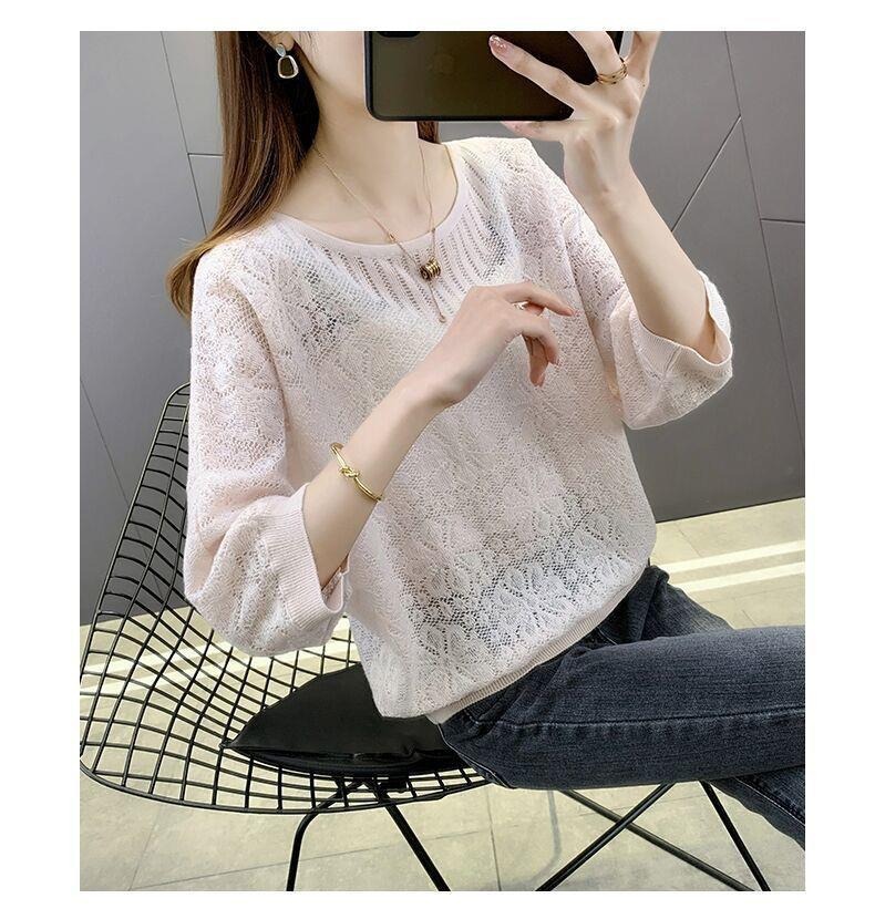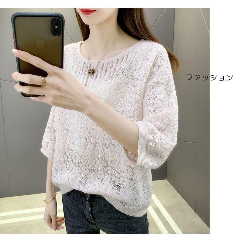 春夏七分袖tシャツゆるい透かし彫りブラウス薄い丸首韓国風ファッション百合女装ニット上着