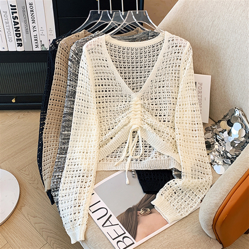 春夏のゆったりとした怠惰な長袖の上着の女性の高級感の日焼け止めのエアコンのブラウスのvネックのニットのデザイン感