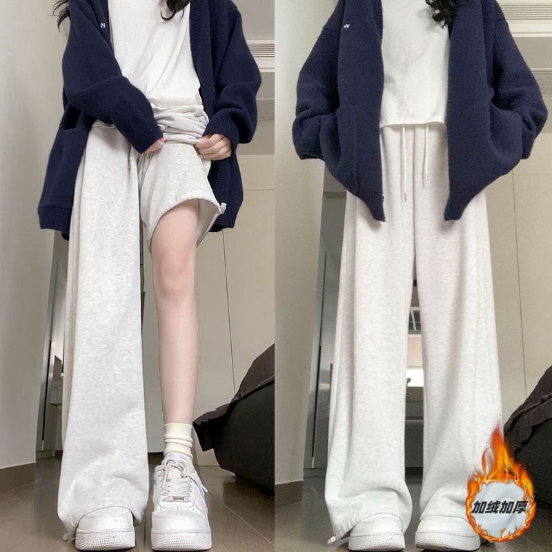 スポーツパンツ女性秋冬2024新型高腰カジュアルゆるいストレートアメリカ風ベルベット広脚白灰色衛ズボン