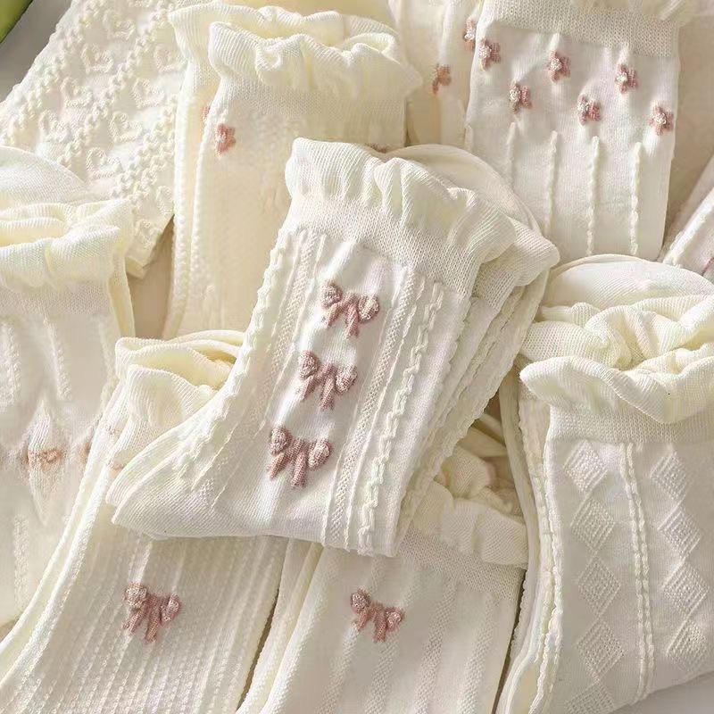 白い花の縁の靴下の子供の蝶結びの中筒の靴下の春の夏の薄い金の通気の学院の風のinsの潮の百合のストッキング