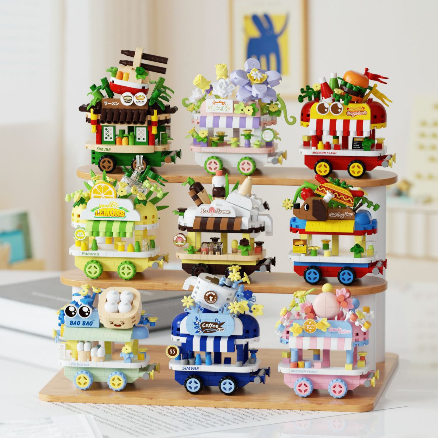 创意美食推车积木街边水果烧烤贩卖车拼装摆件玩具送女孩生日礼物