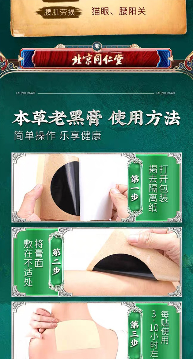 北京同仁堂内廷上三七丹参老黒膏は肩首と腰と足の関節で膝と腰椎を貼り付けます。