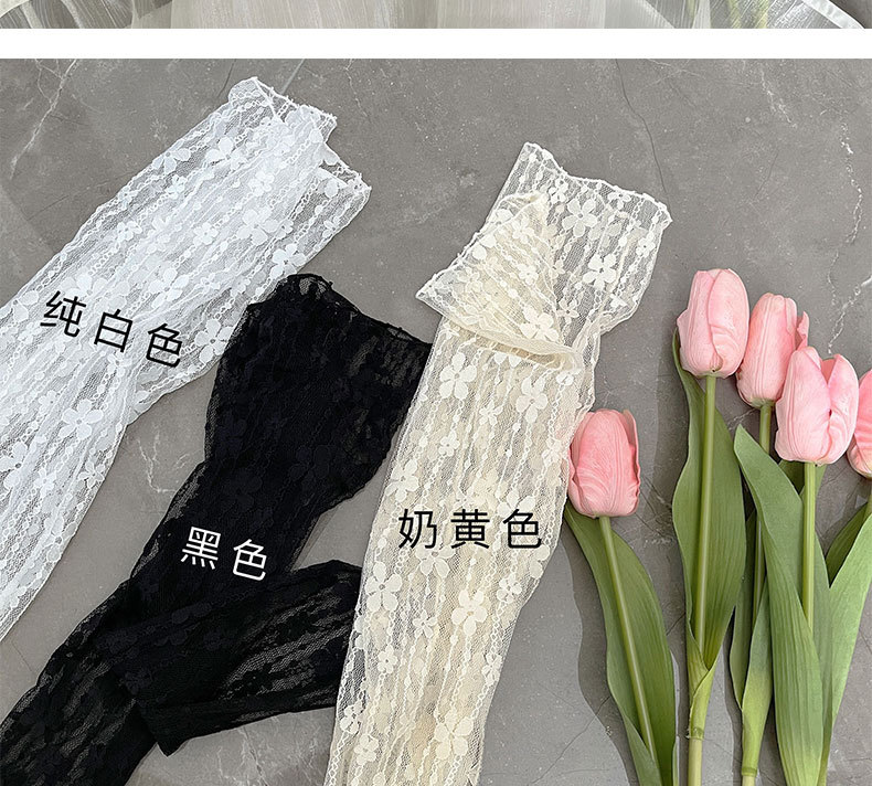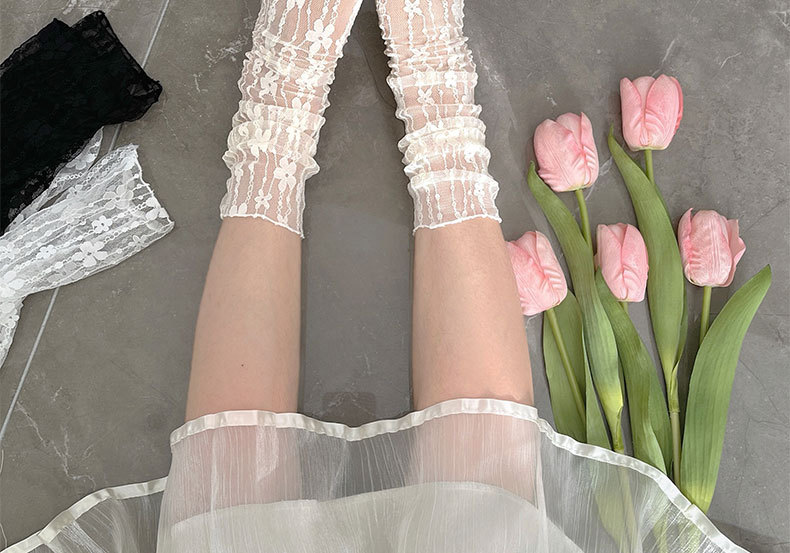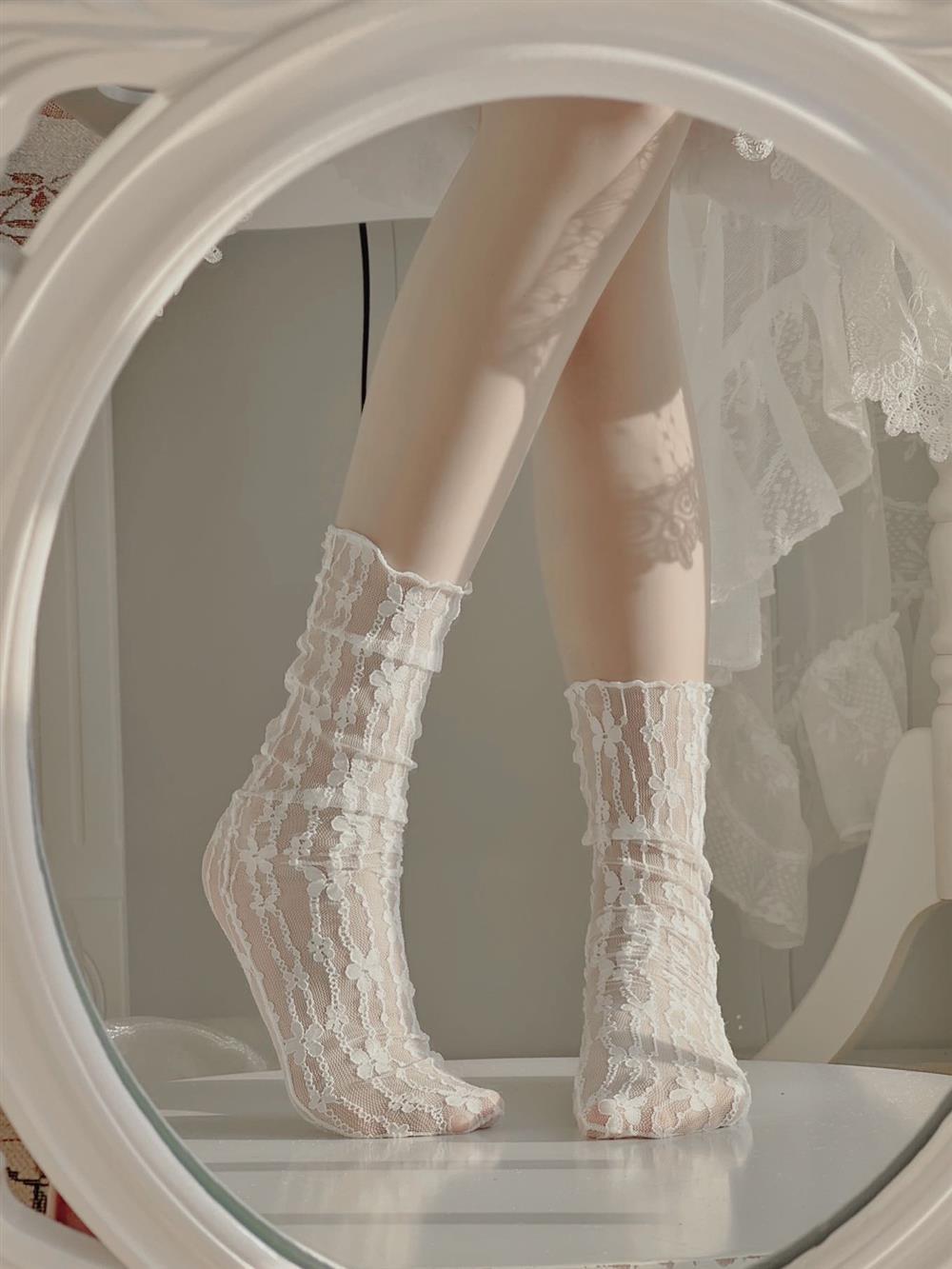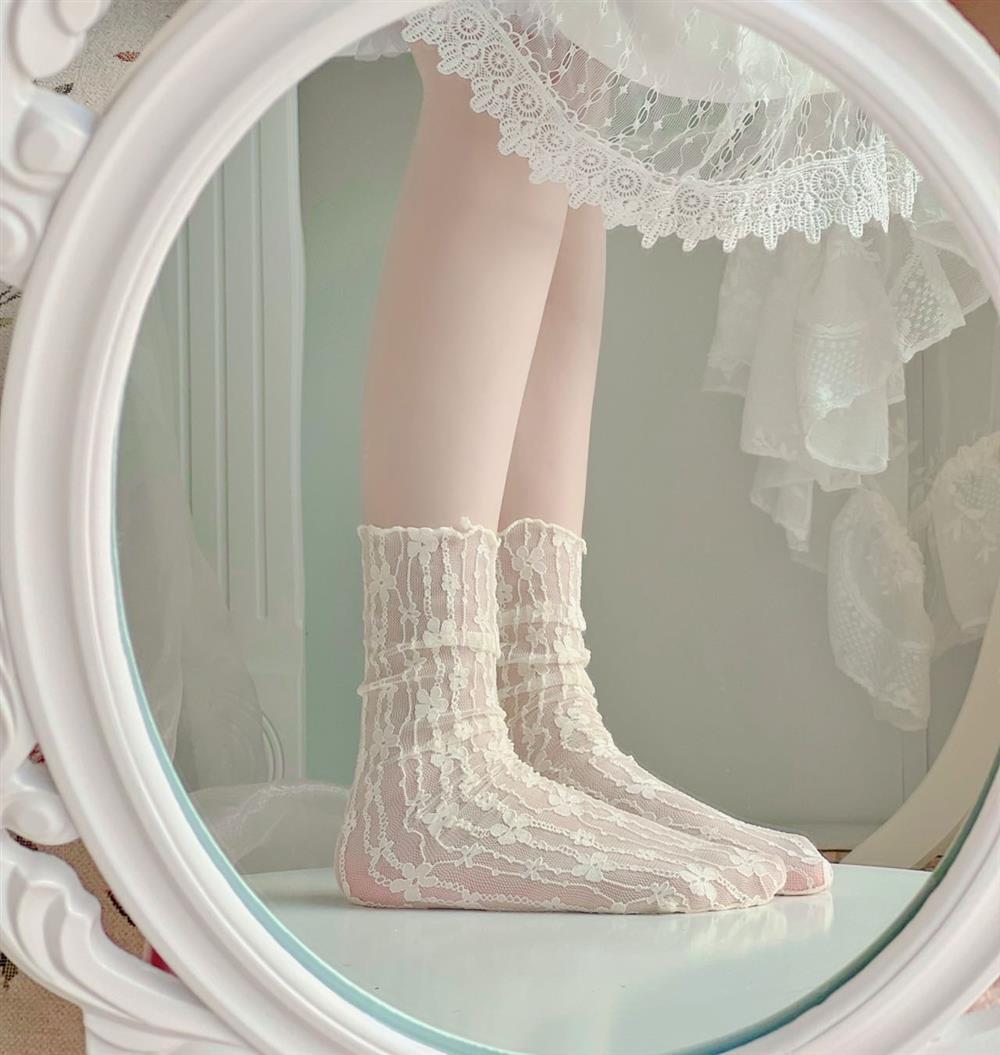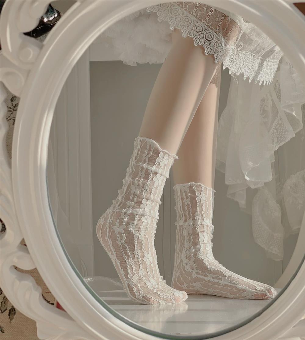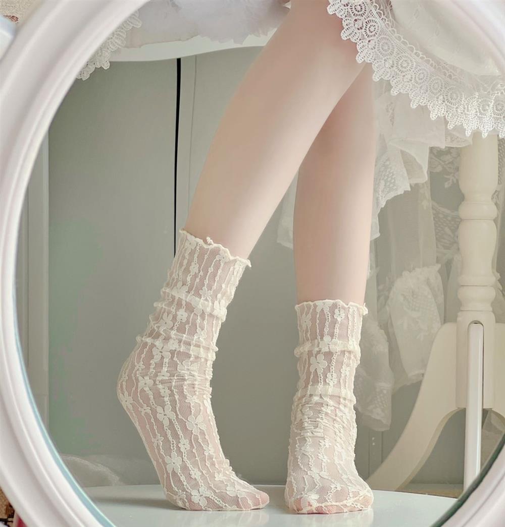 超仙らしい花柄の薄手ソックス、夏用レースソックス、メッシュ素材の白いレース縁のミドル丈ソックス(女性用)