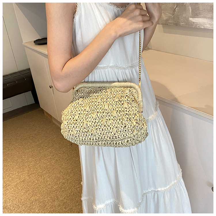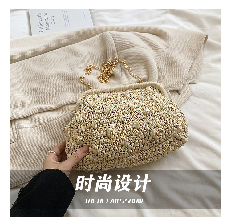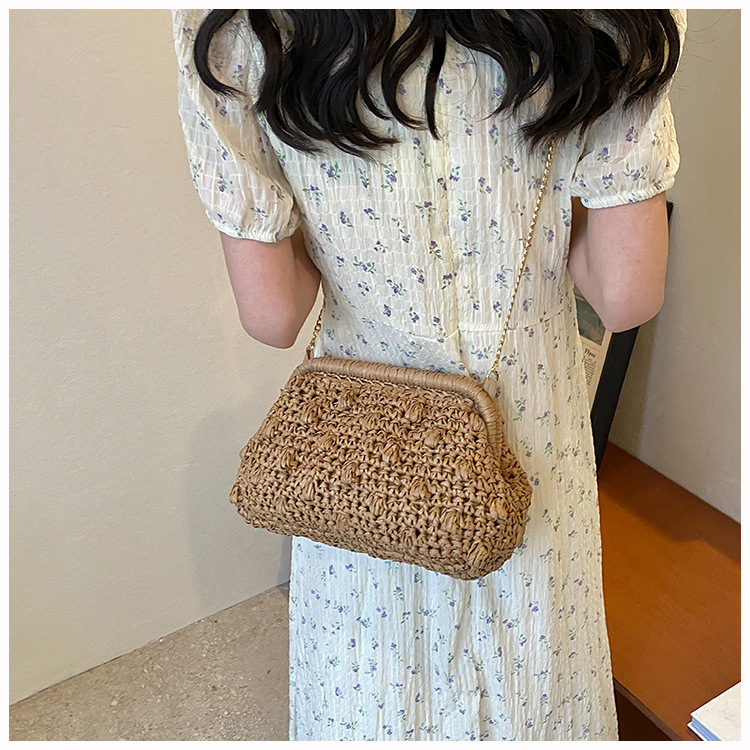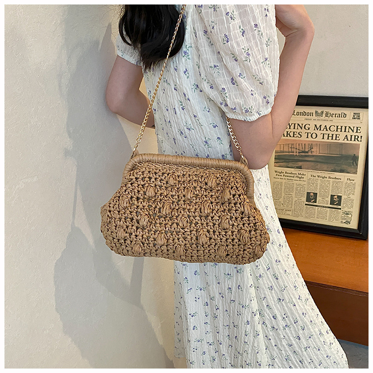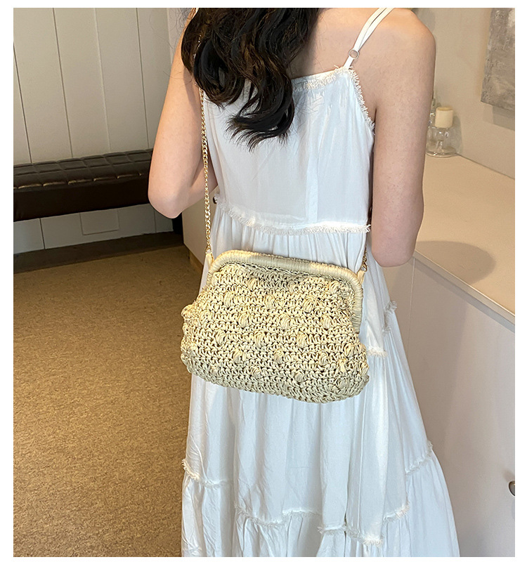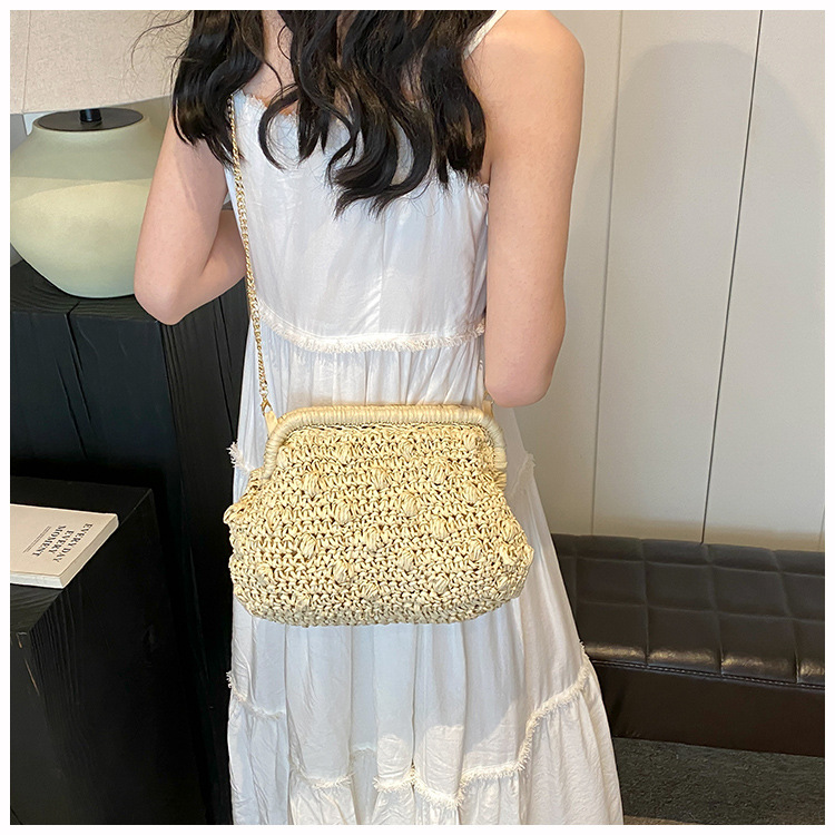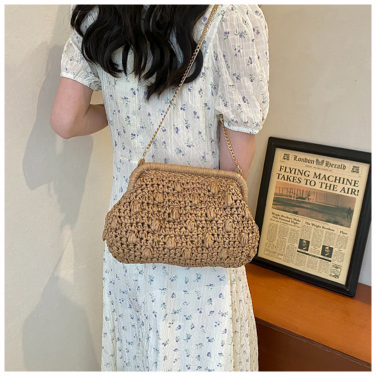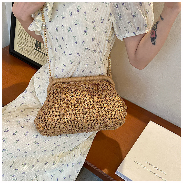 バッグ女性草編みバッグ小衆編みファッションレトロ挟み貝殻カバンカジュアル片肩斜め掛けリゾートビーチバッグ