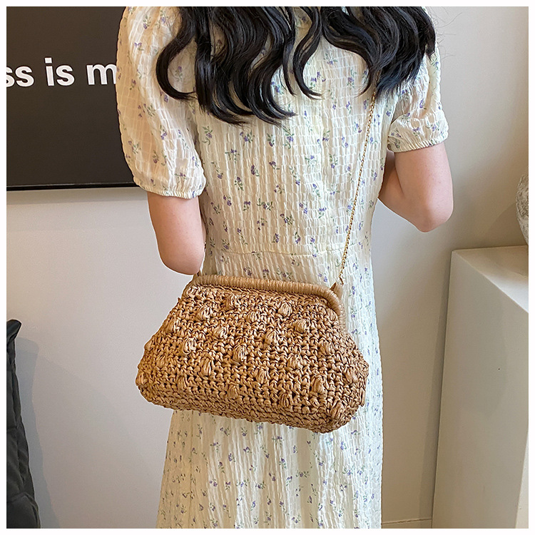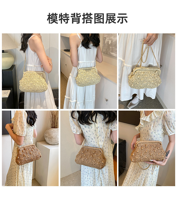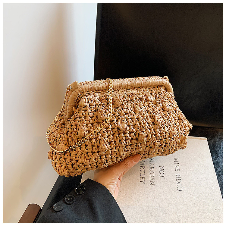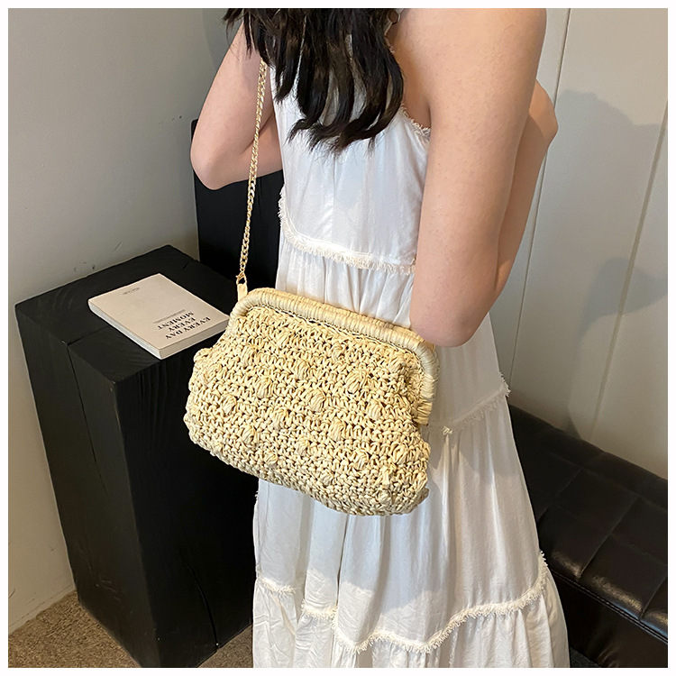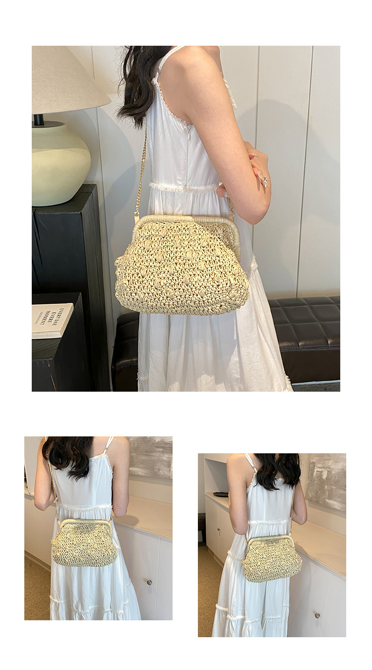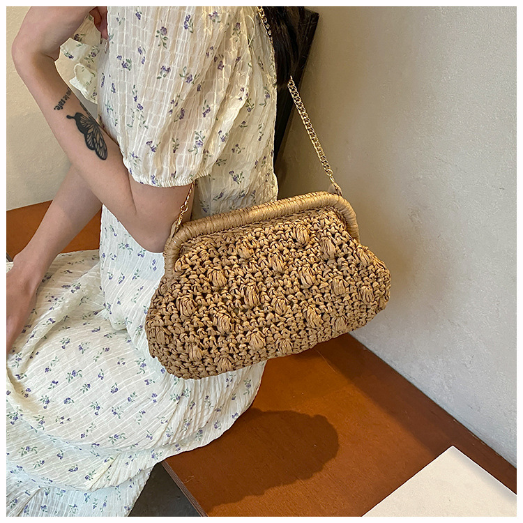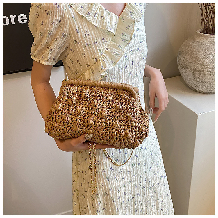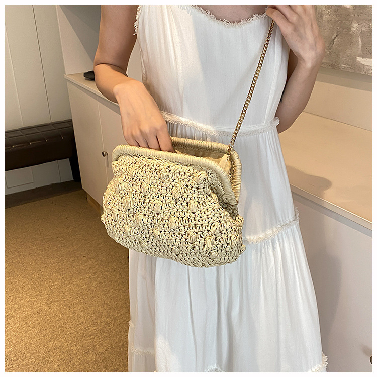 バッグ女性草編みバッグ小衆編みファッションレトロ挟み貝殻カバンカジュアル片肩斜め掛けリゾートビーチバッグ