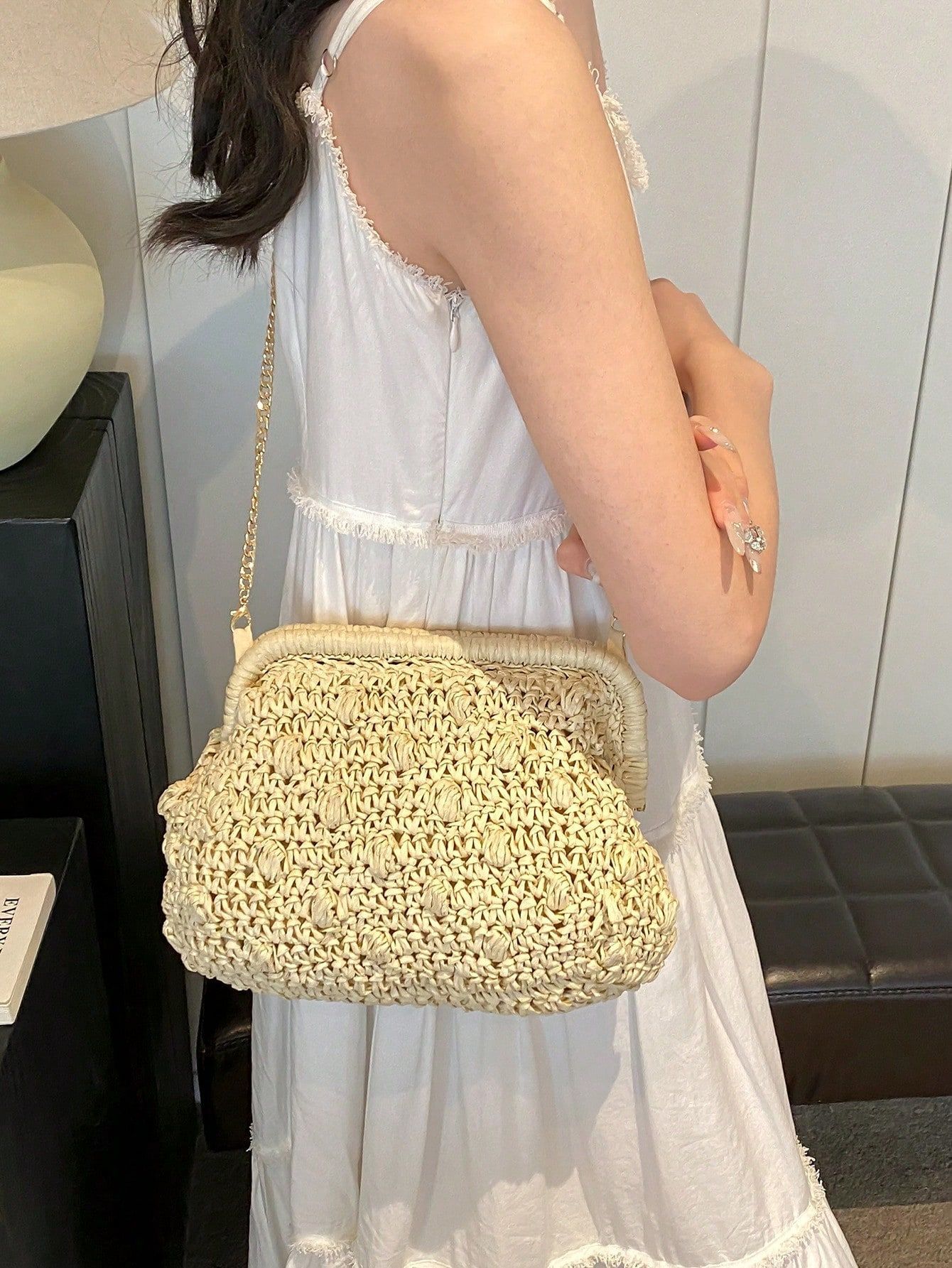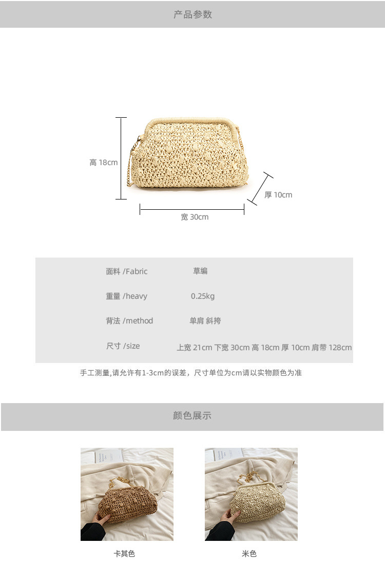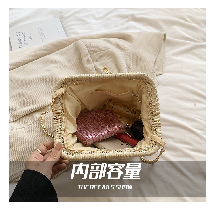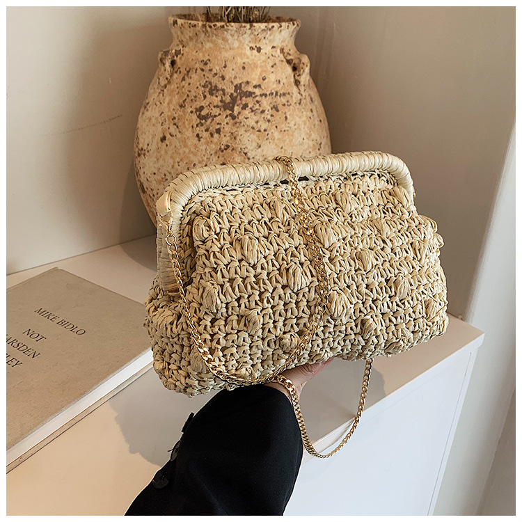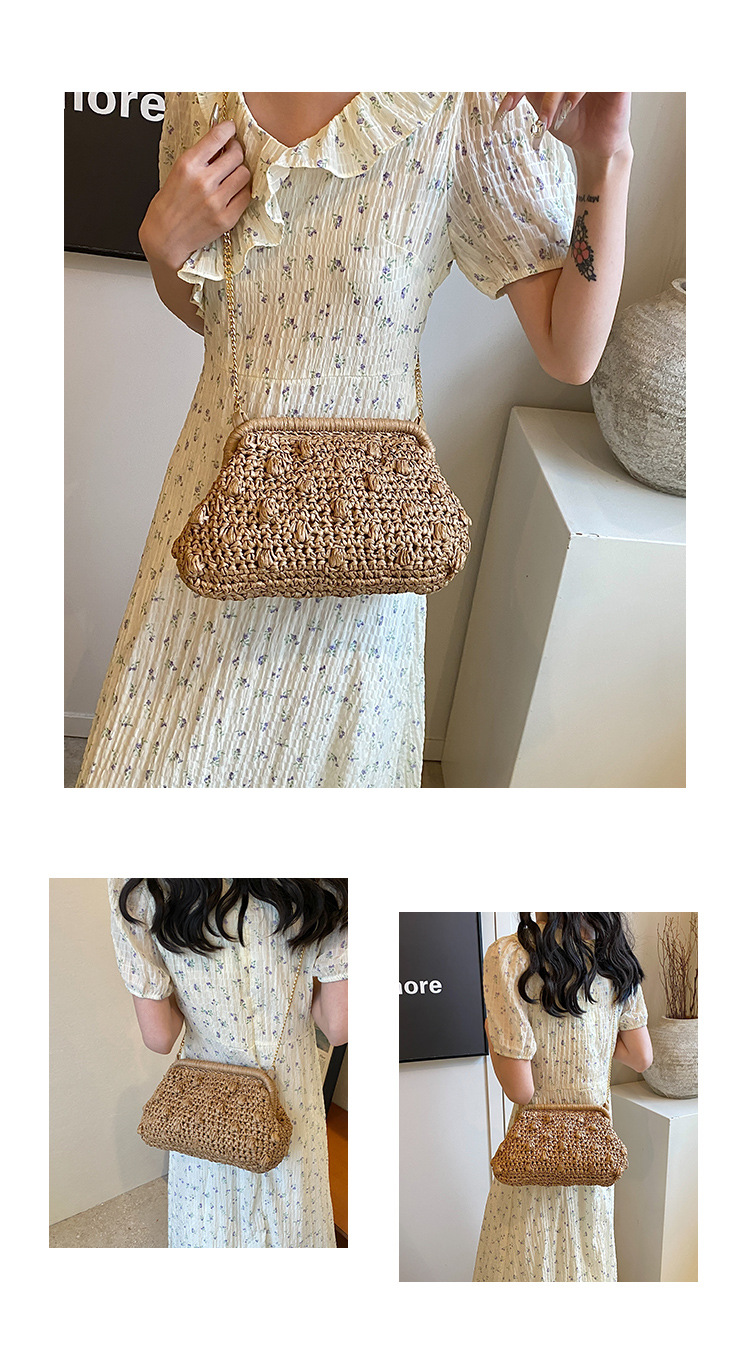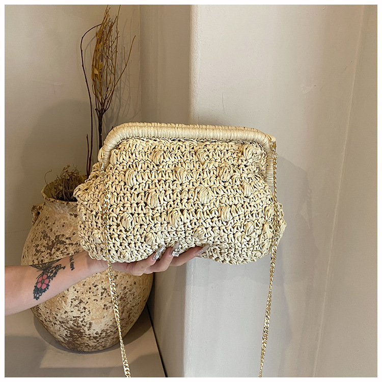 バッグ女性草編みバッグ小衆編みファッションレトロ挟み貝殻カバンカジュアル片肩斜め掛けリゾートビーチバッグ