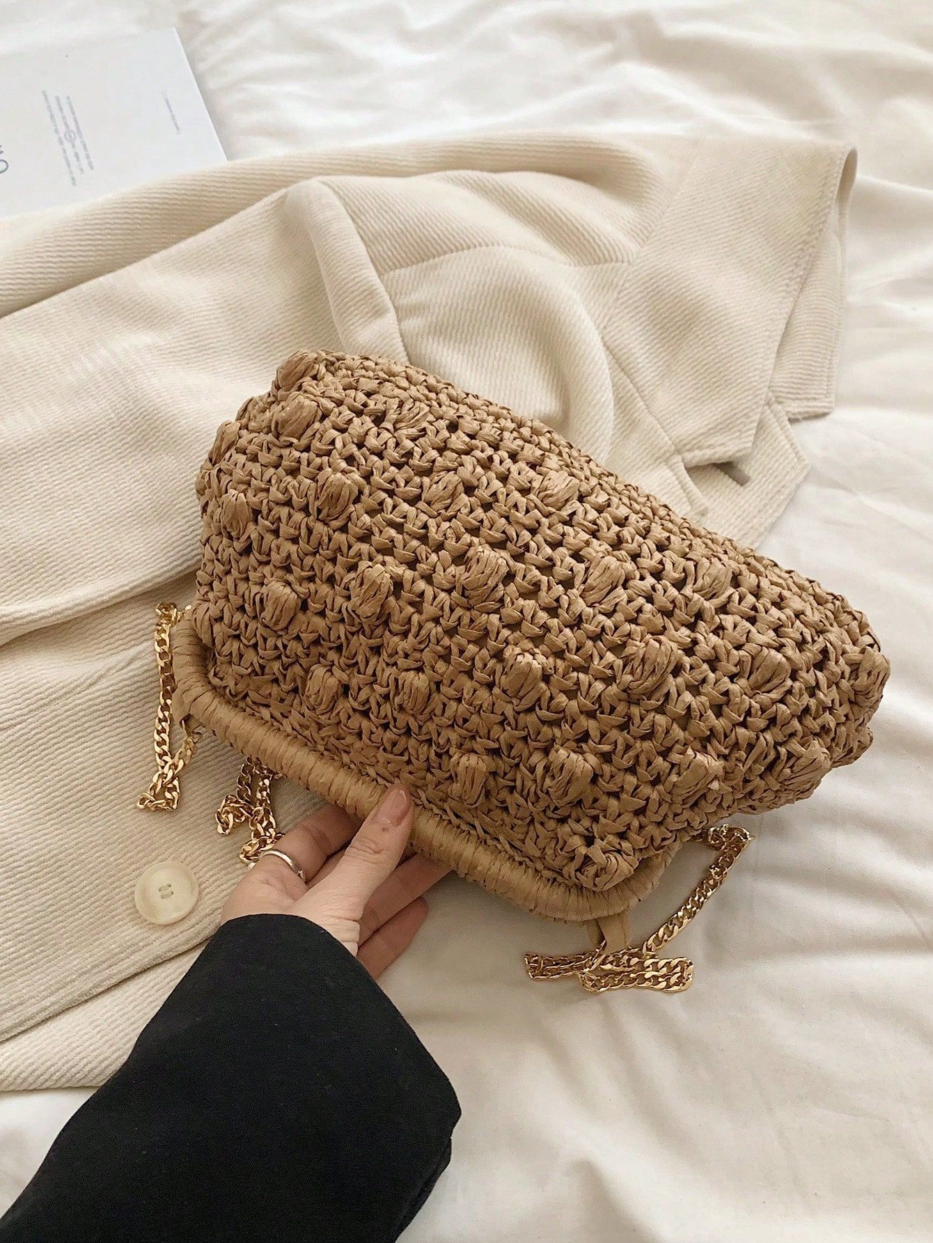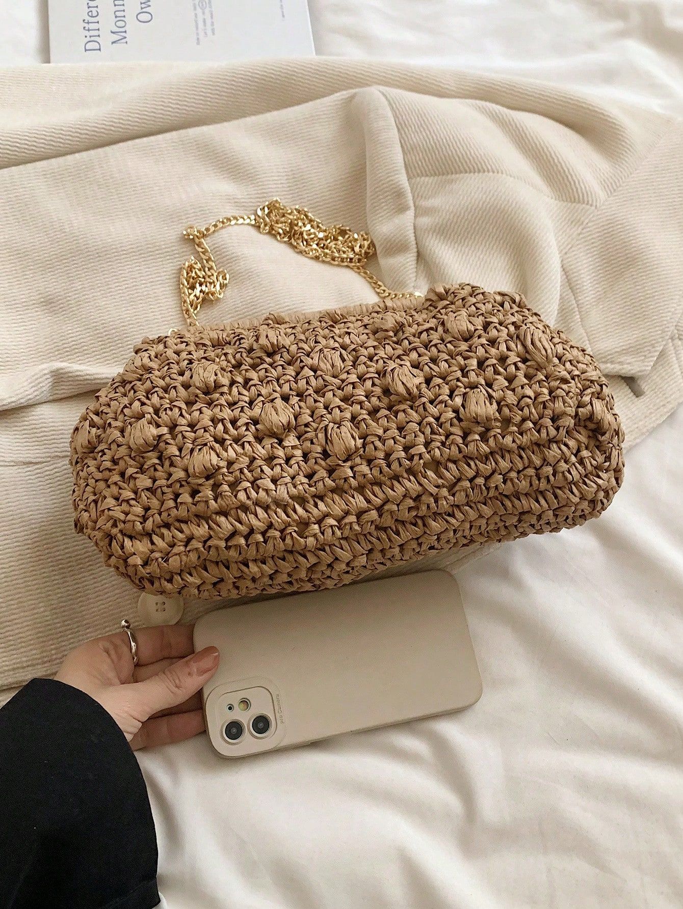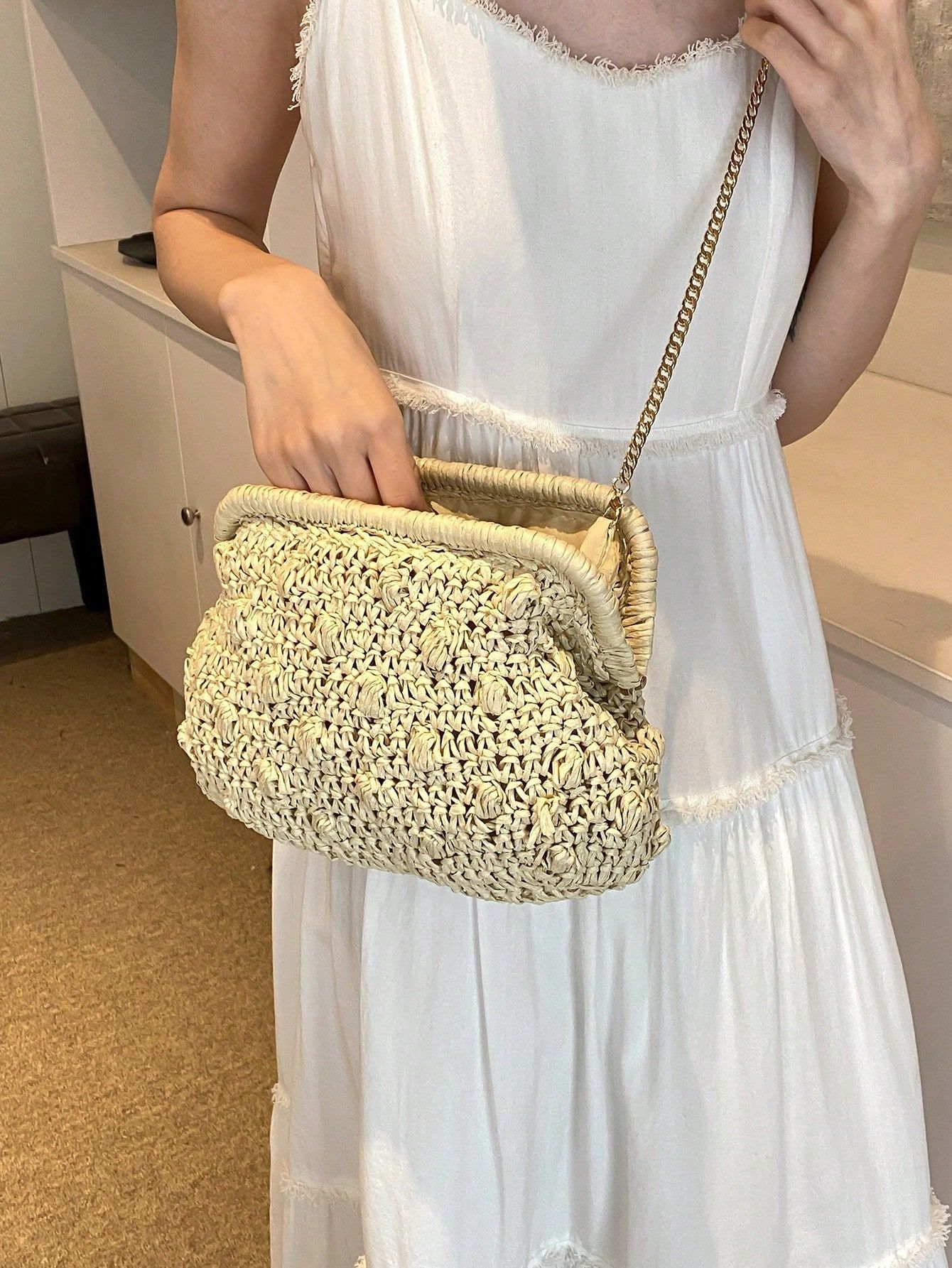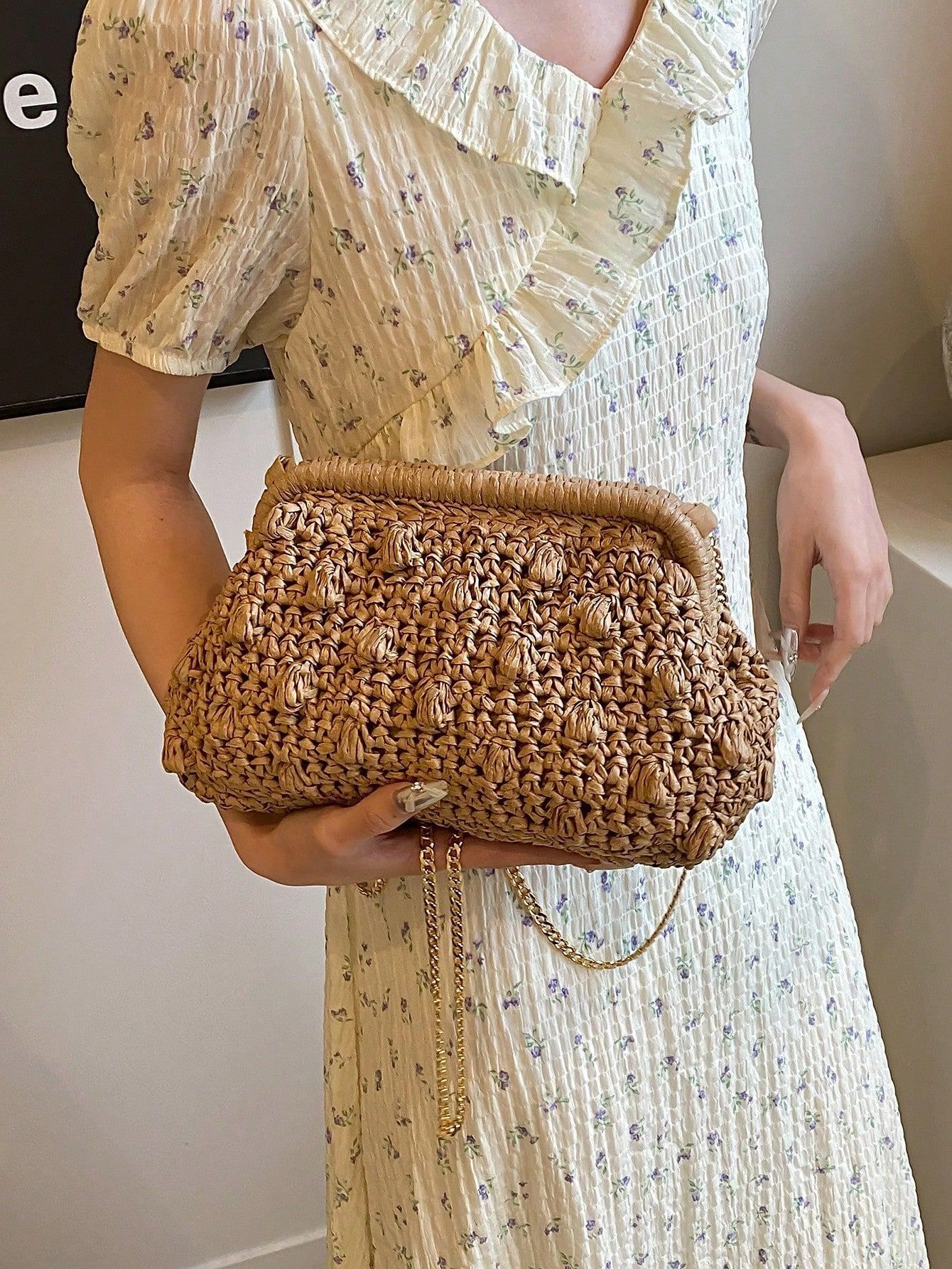 バッグ女性草編みバッグ小衆編みファッションレトロ挟み貝殻カバンカジュアル片肩斜め掛けリゾートビーチバッグ