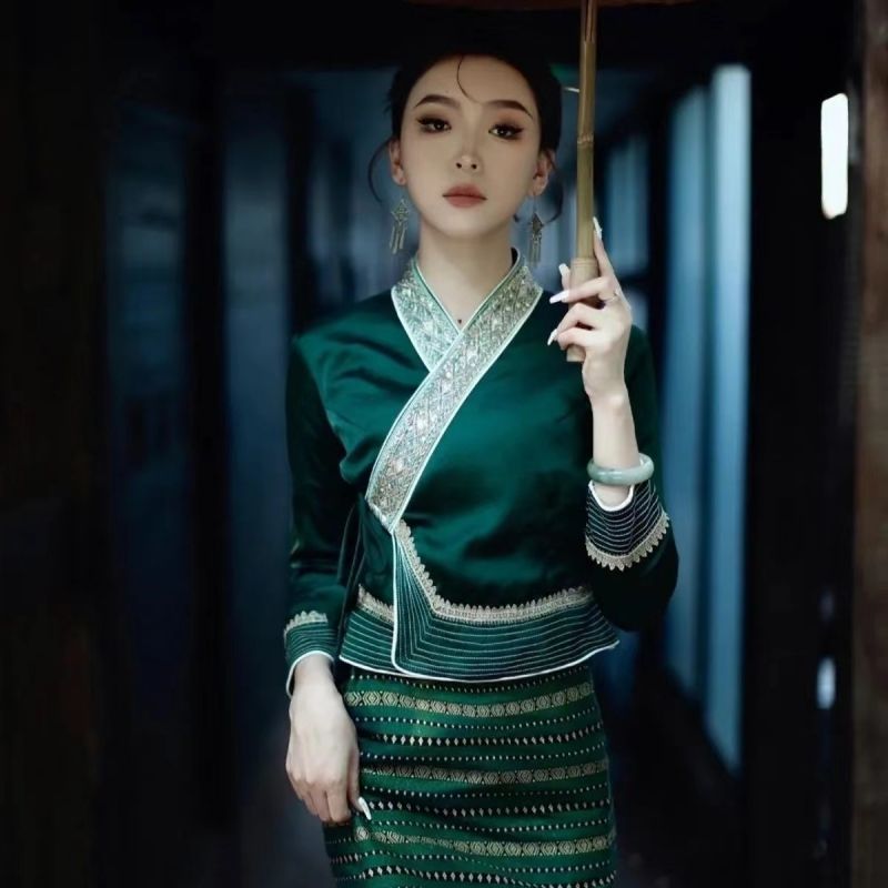 水かけ祭りの西双版納の新型タイ族の婦人服のスーツの旅行は気質の写真の高級な大きいサイズの仕事の服装をたたきます。