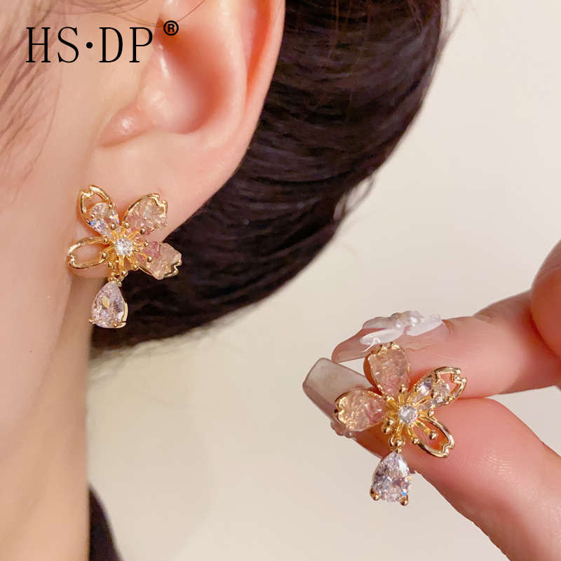 S925銀針気質ファッション小清新粉水晶花びら吊り水滴イヤリング女性甘いイヤリング卸売り