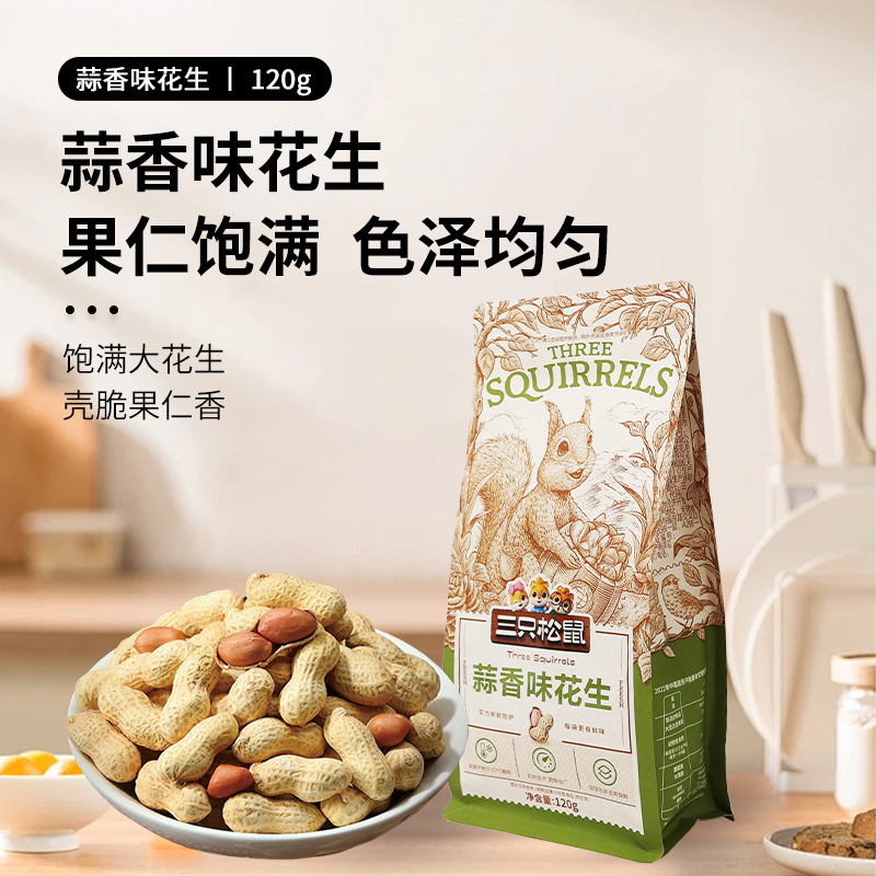 三只松鼠蒜香味花生120g袋装煮花生米晒干带壳零食炒货包邮