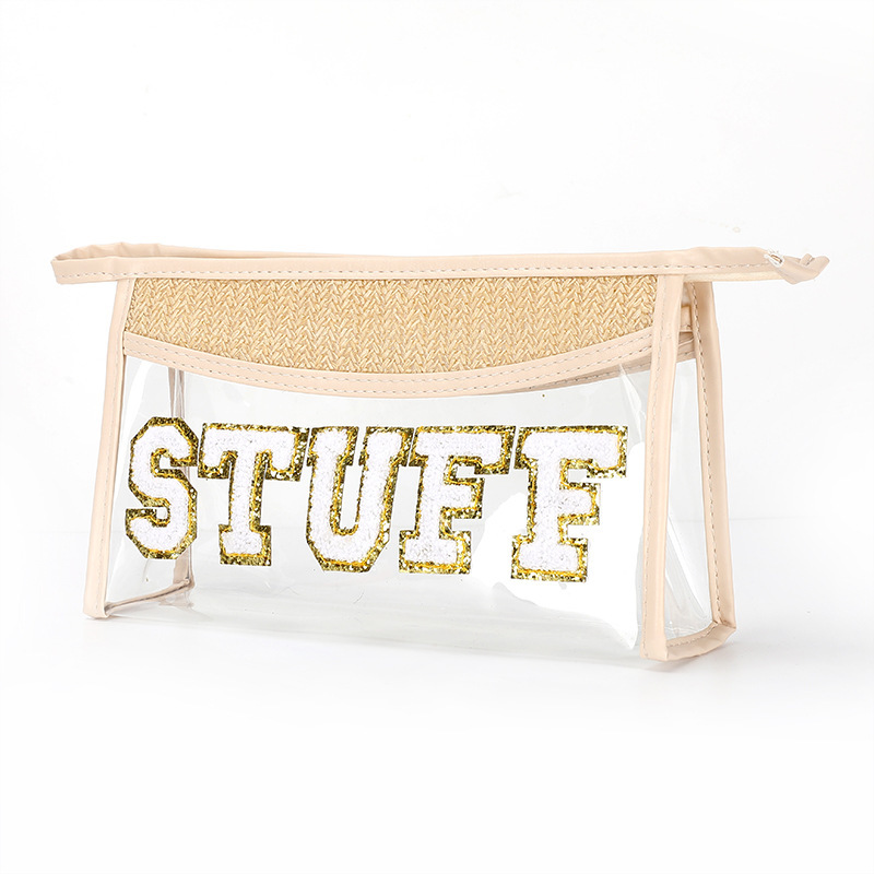 新型クロスボーダーPVC素材、草編みとシェニール文字を組み合わせた透明化粧ポーチ、大容量防水携帯収納バッグ