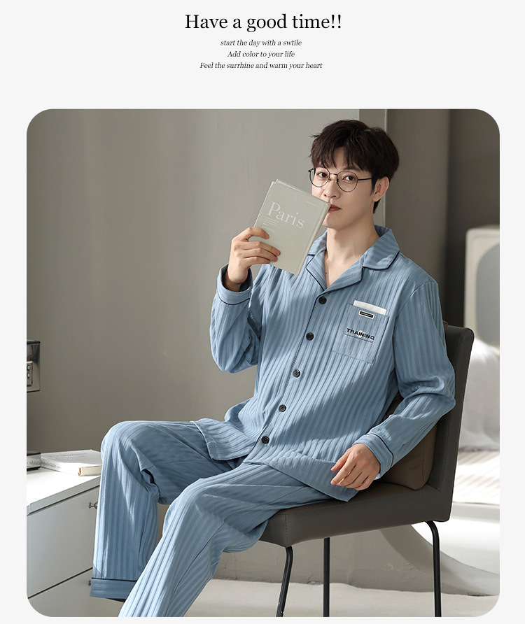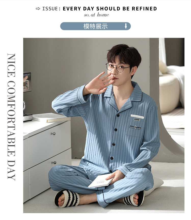 春と秋の男性用パジャマ、純綿長袖メンズプラスサイズ、若者用秋冬ホーム服、屋外で着用して暖かく保つことができます。