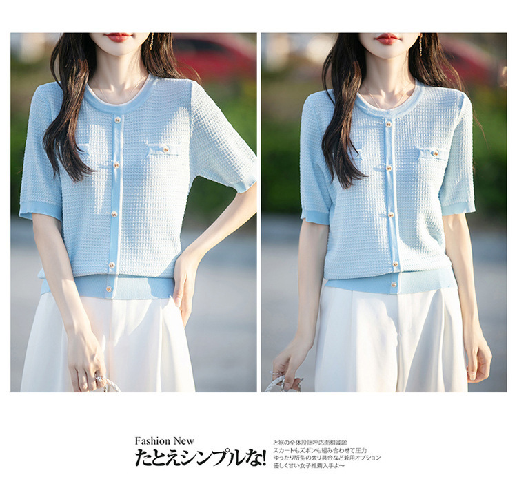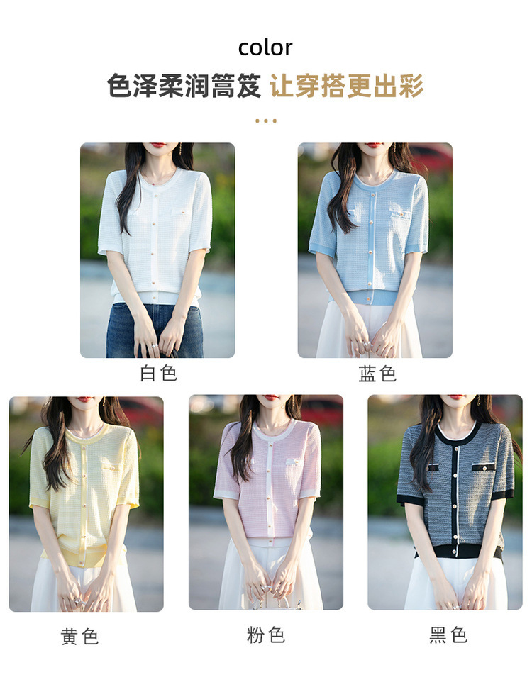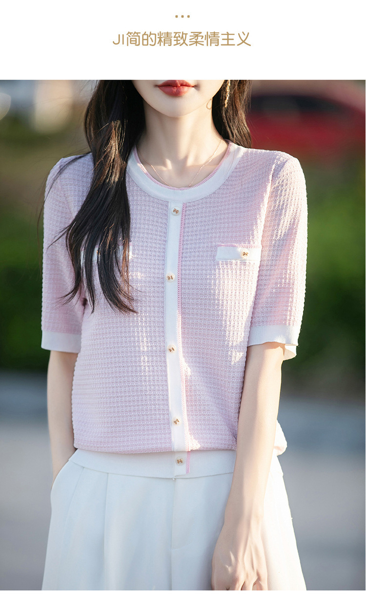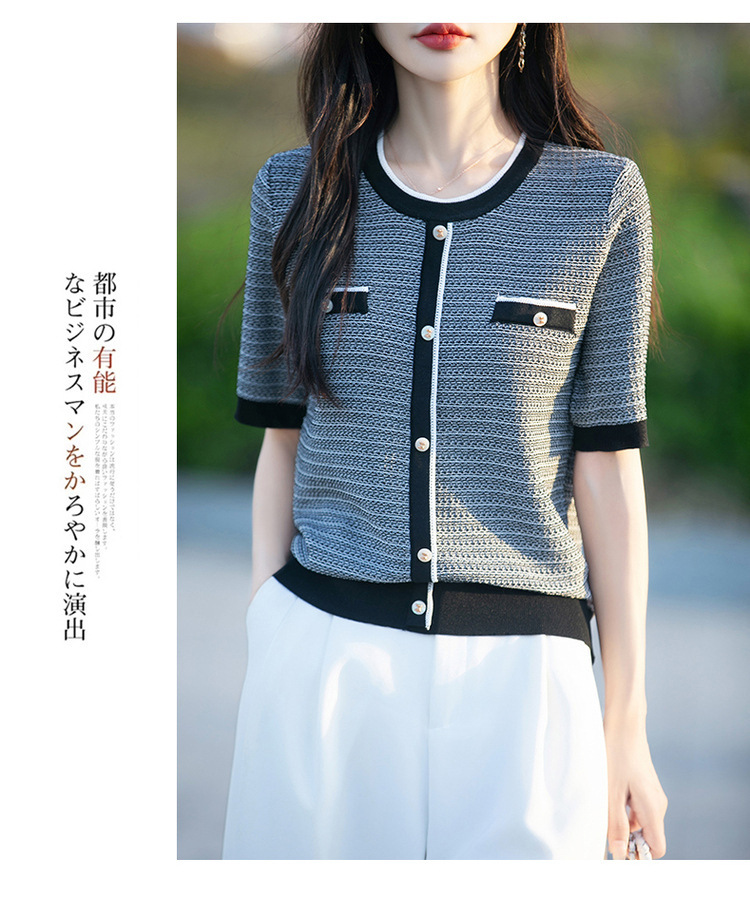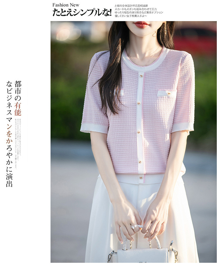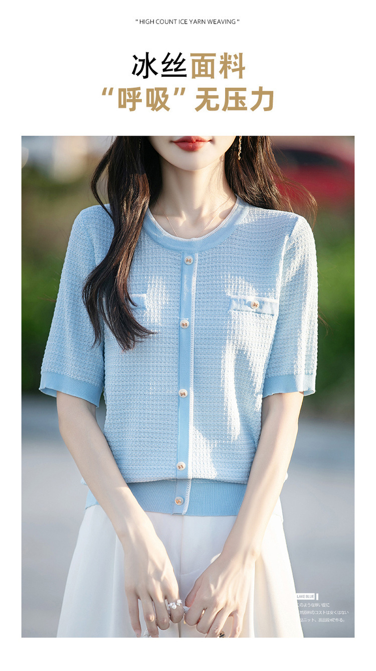 2025年春夏新作小香風氷糸丸首ニット半袖色合わせ偽カーディガン